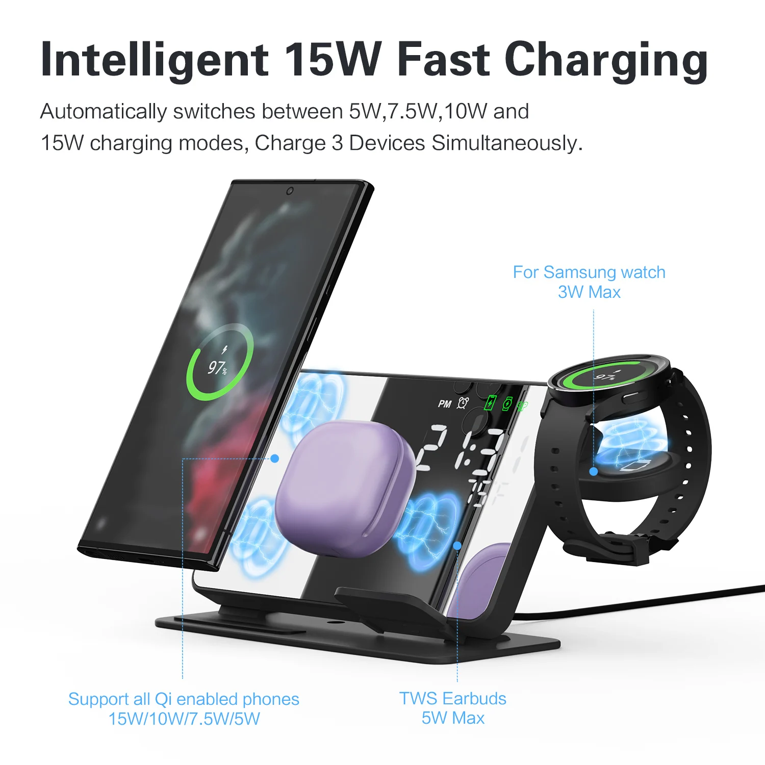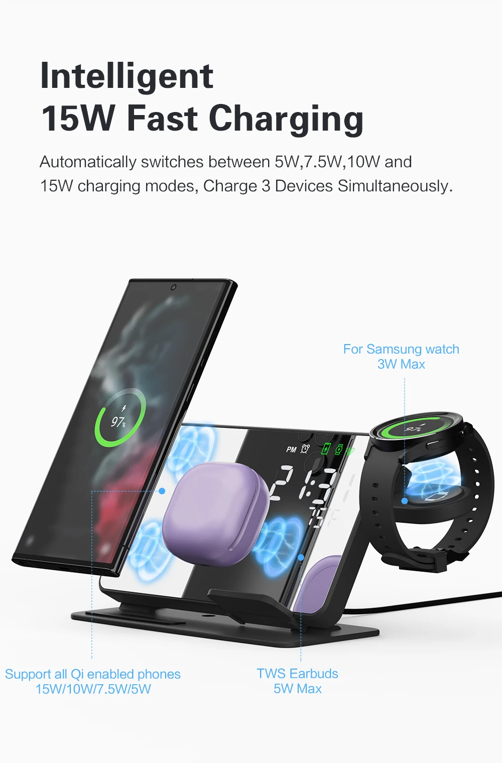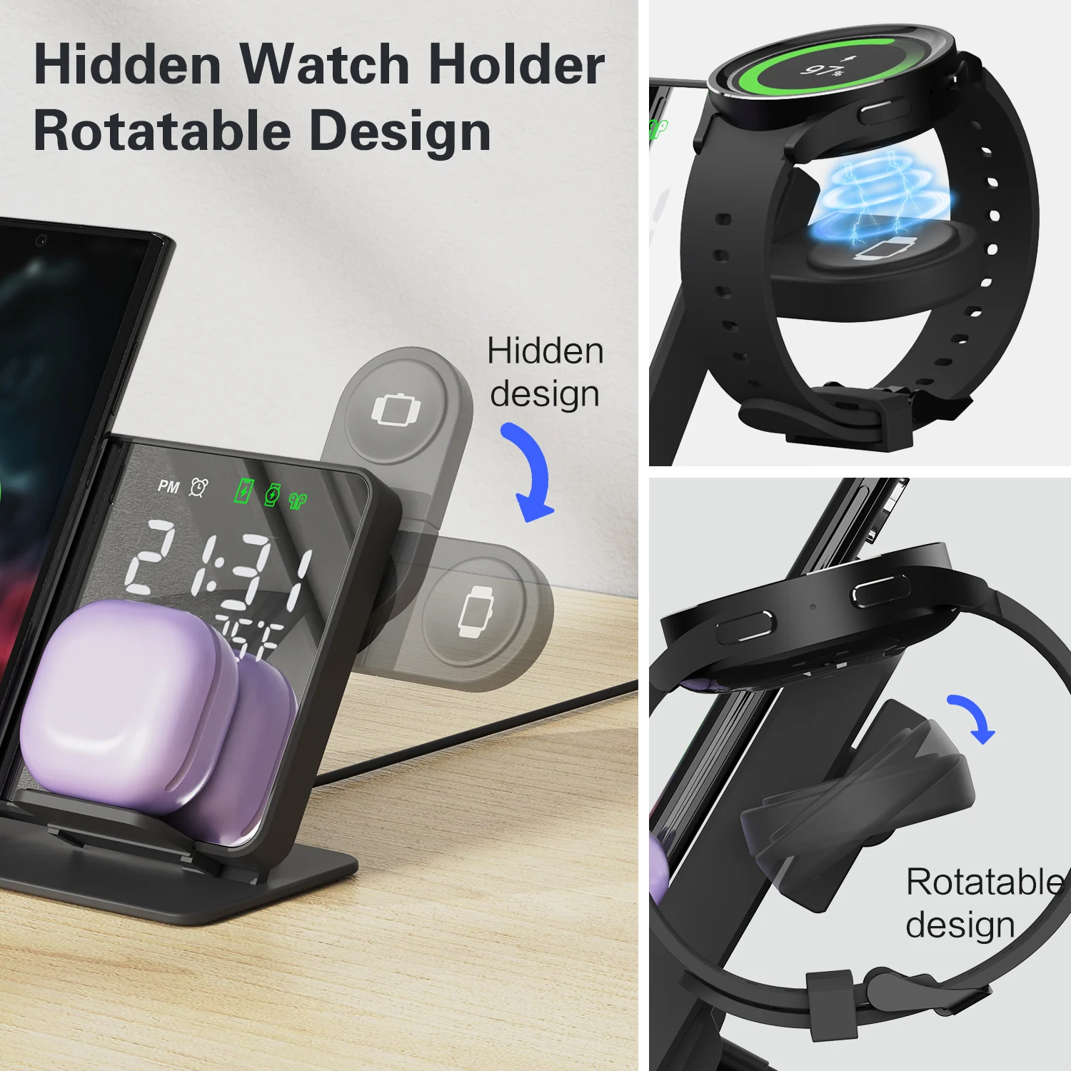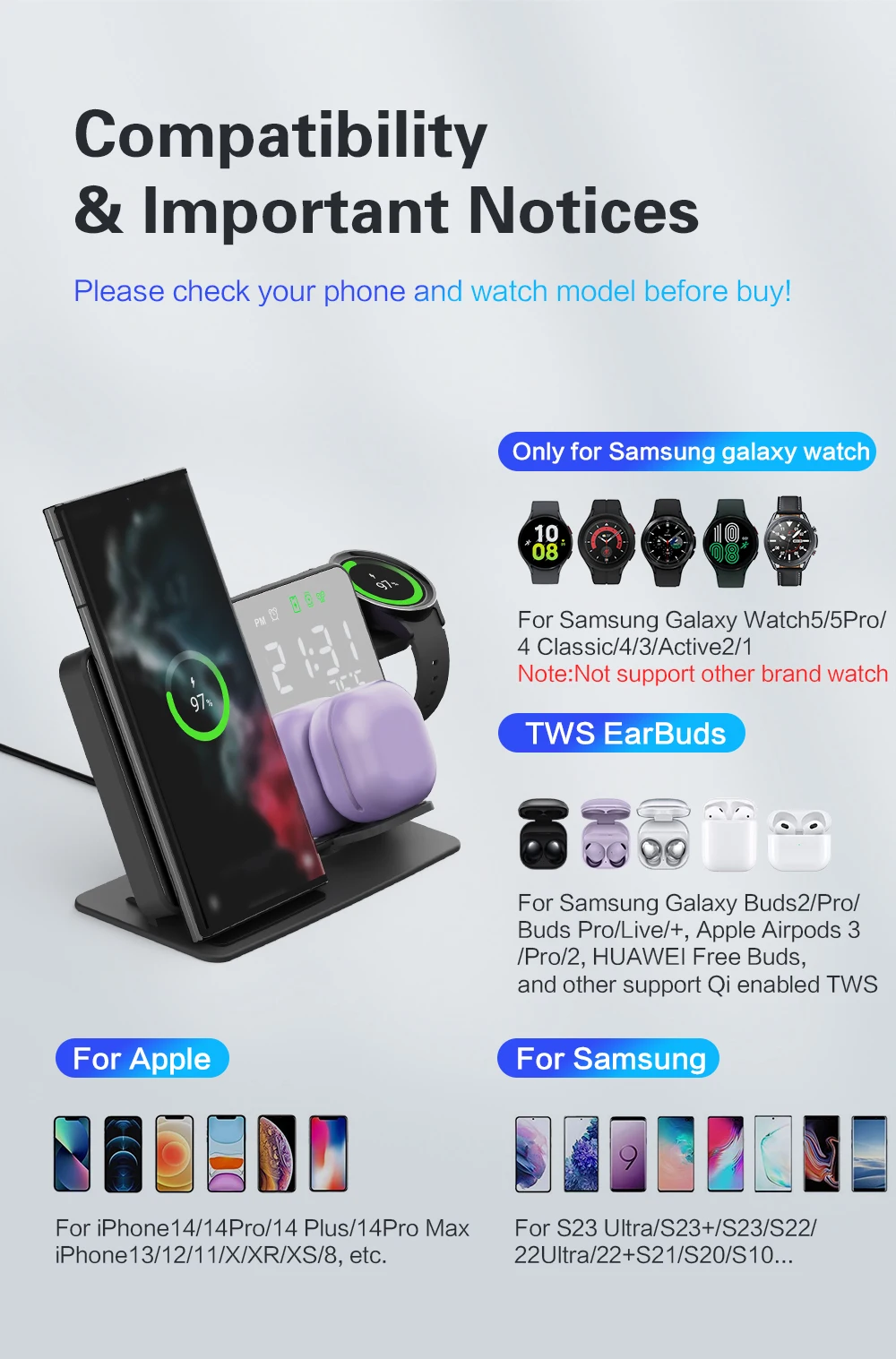 Comprar Soporte de cargador inalámbrico 3 en 1 para Samsung Galaxy S23 S22 S21 estación de carga Ultra rápida para reloj 5 Pro/5/4 soporte Buds 2