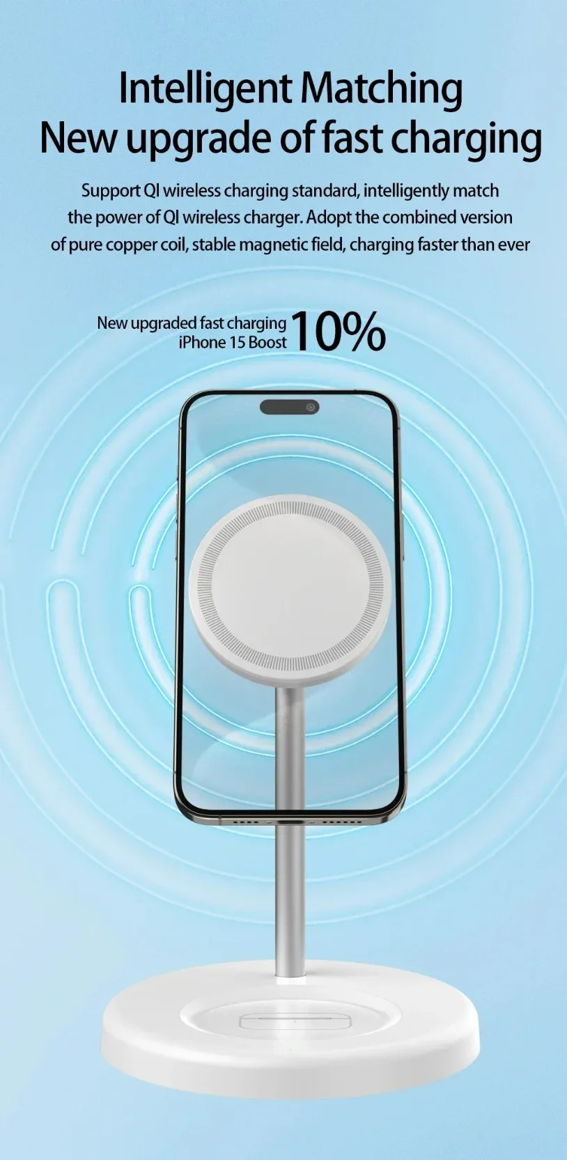 La fuerte función de carga magnética del soporte de carga 2 en 1 es directamente adecuada para la serie iPhone 15/14/13/12.