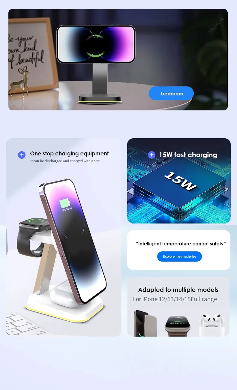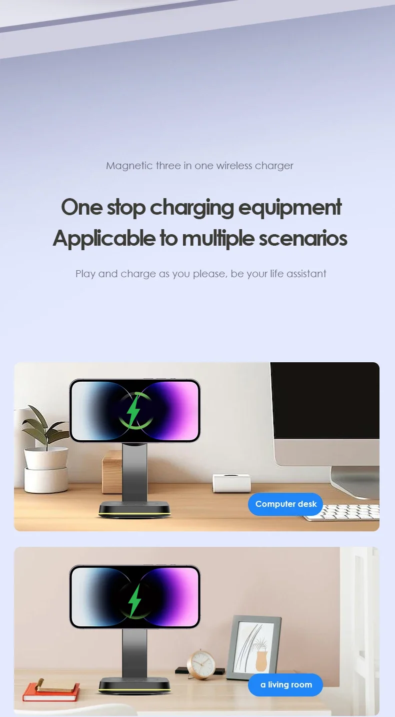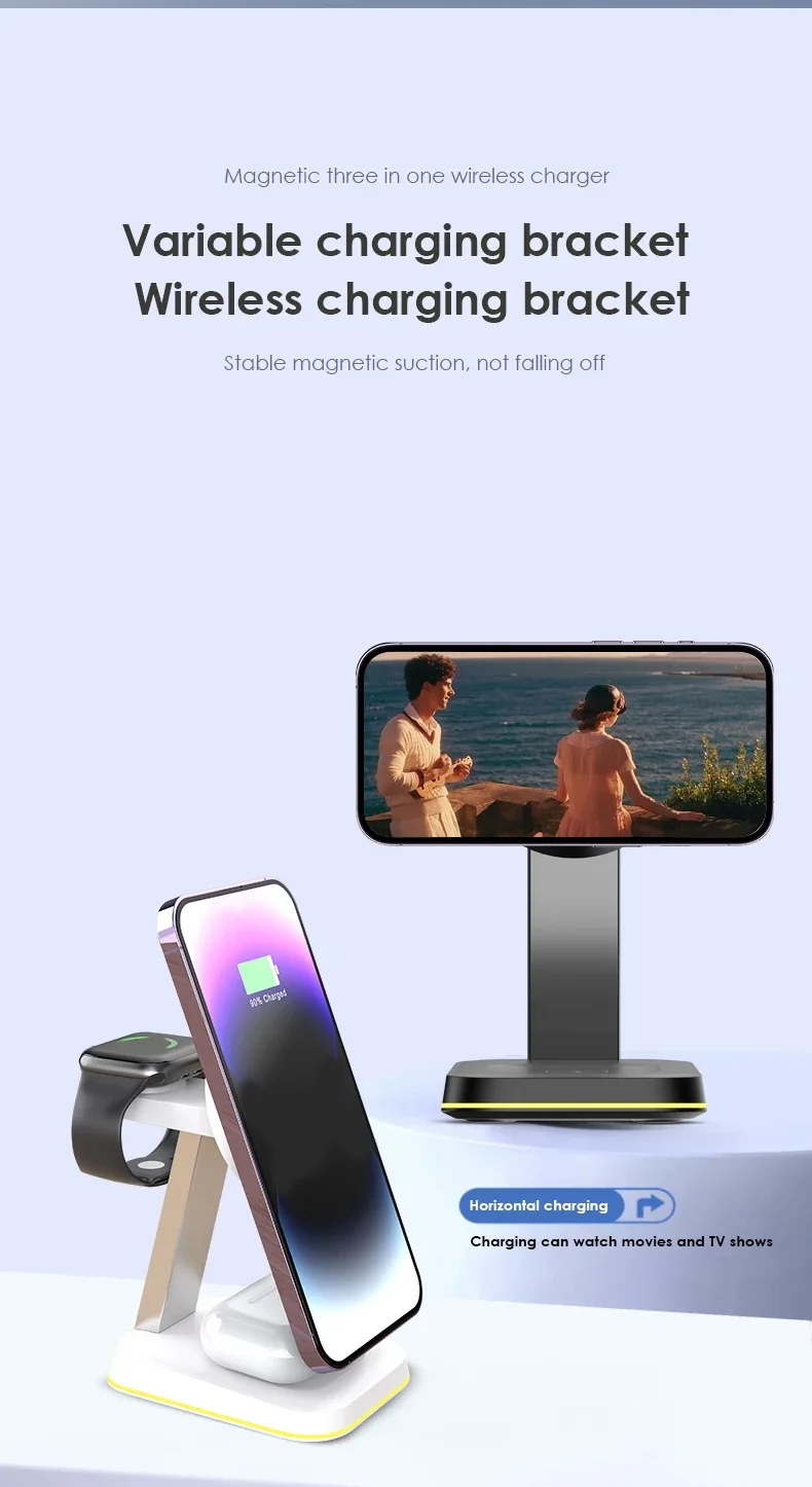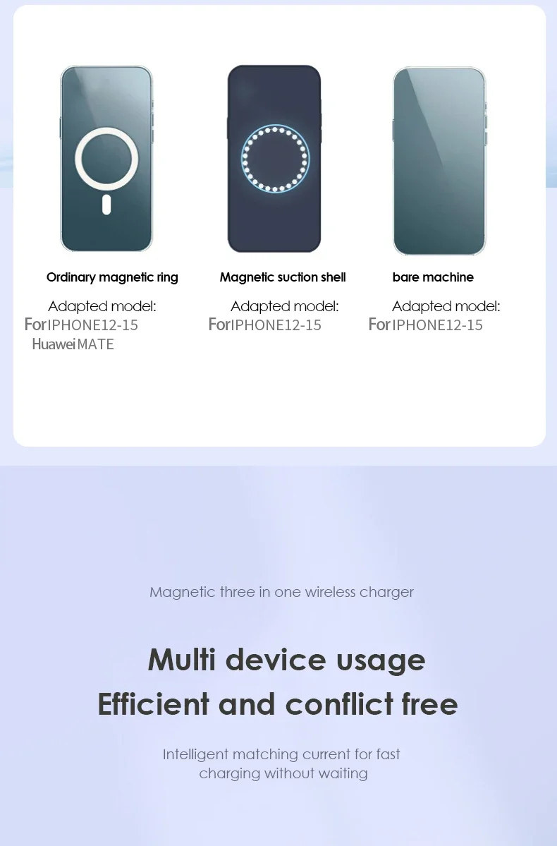 ★ Soportes de carga inalámbricos 3 en 1★El cargador inalámbrico magnético 3 en 1 hace que la carga rápida sea segura y sencilla.La estación de carga adopta la tecnología magnética más avanzada y una alineación instantánea y precisa en solo 1 segundo, brindándole una experiencia de carga inalámbrica magnética rápida y estable.El cargador para iPhone admite 360° rotación para mantener el iPhone en cualquier dirección según el escenario.