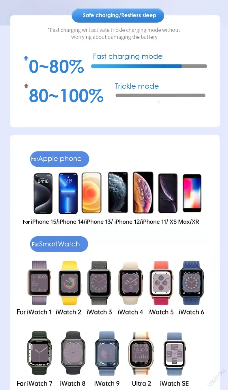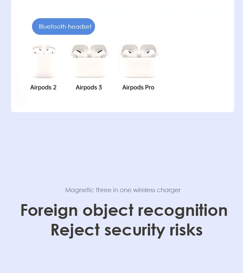 �� Seguridad de protección inteligente más seguraEsta estación de carga para Apple utiliza una lámina de aislamiento magnético profesional sin radiación para protegerlo a usted y a su familia.El chipset inteligente incorporado proporciona protección contra sobrecorriente, sobretensión y sobretemperatura para la carga.Cuando la temperatura sea demasiado alta, la carga se interrumpirá automáticamente para evitar daños a la batería.