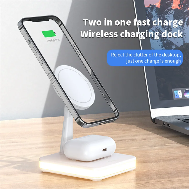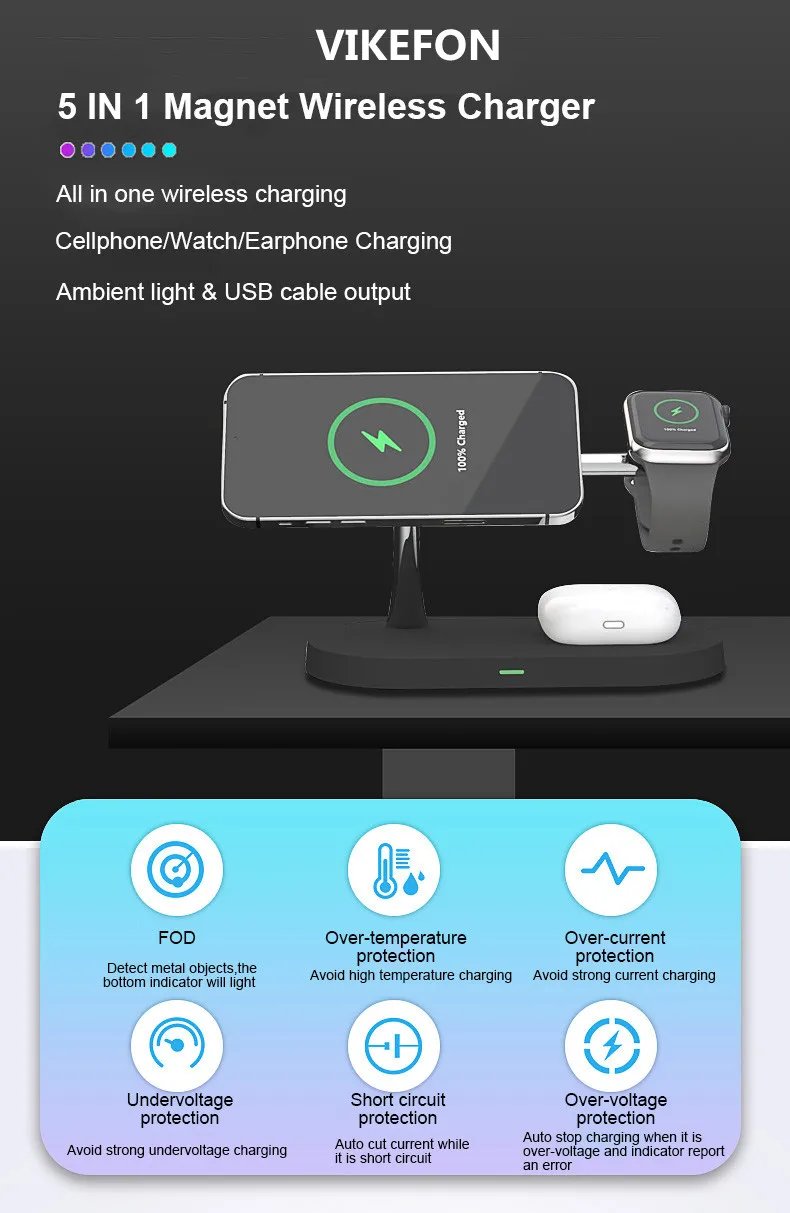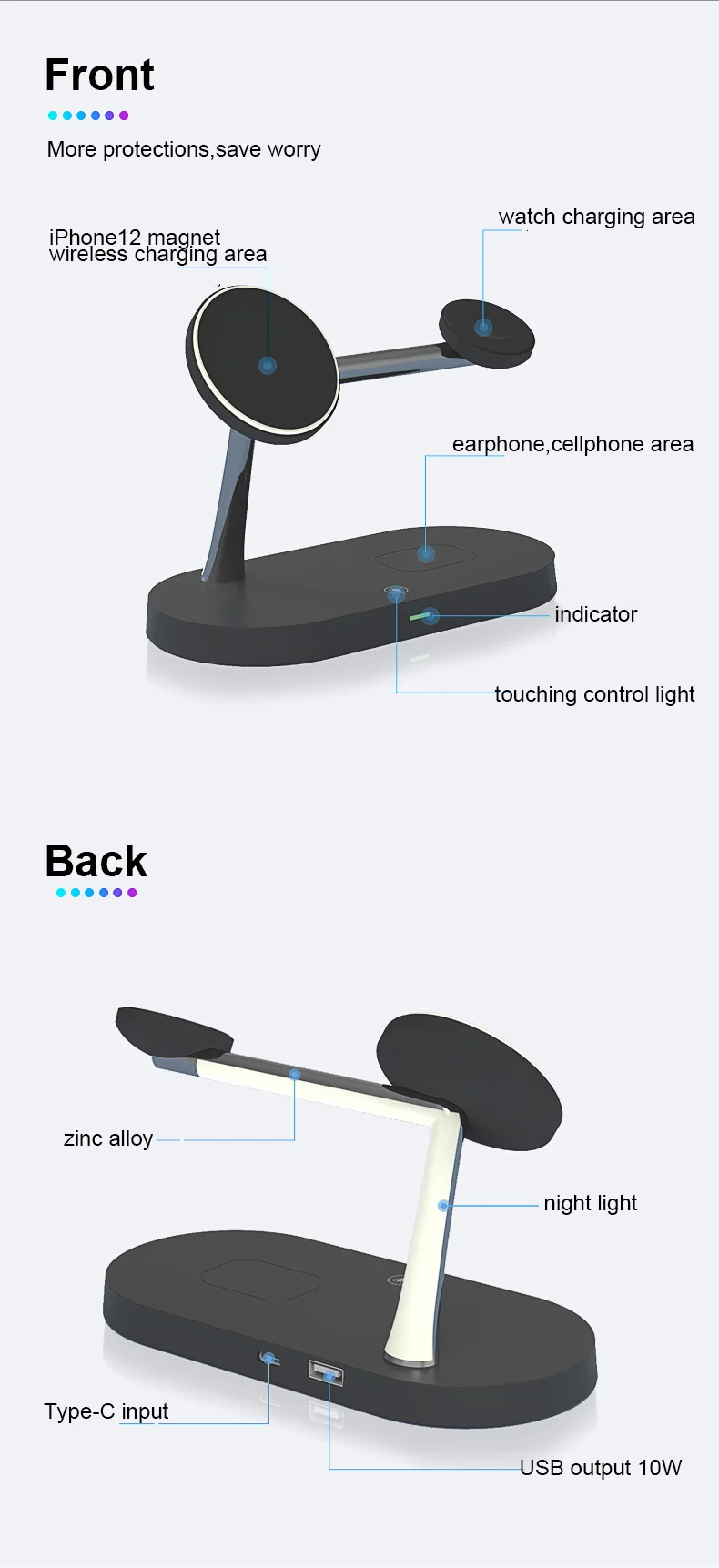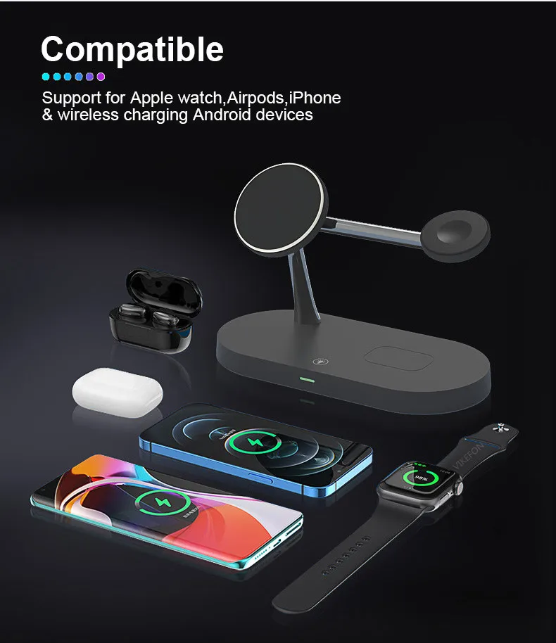 【 Cargador inalámbrico magnético 3 en 1 con imán incorporado de alta calidad】La estación de carga magnética puede alinear con precisión la mejor posición de carga inalámbrica de su dispositivo, brindándole una experiencia de carga más rápida y conveniente. Al cargar en el cargador inalámbrico magnético, el teléfono puede girar 360 °, colocar su teléfono vertical u horizontalmente para cargar al instante, y usar su teléfono mientras se carga.