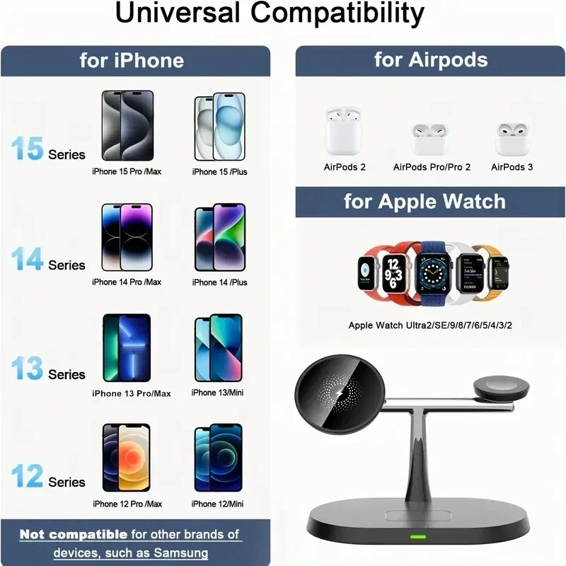 Cargador inalámbrico 3.3 en 1 para todos los relojes/teléfonos/AirPods de Apple que admiten carga inalámbrica.