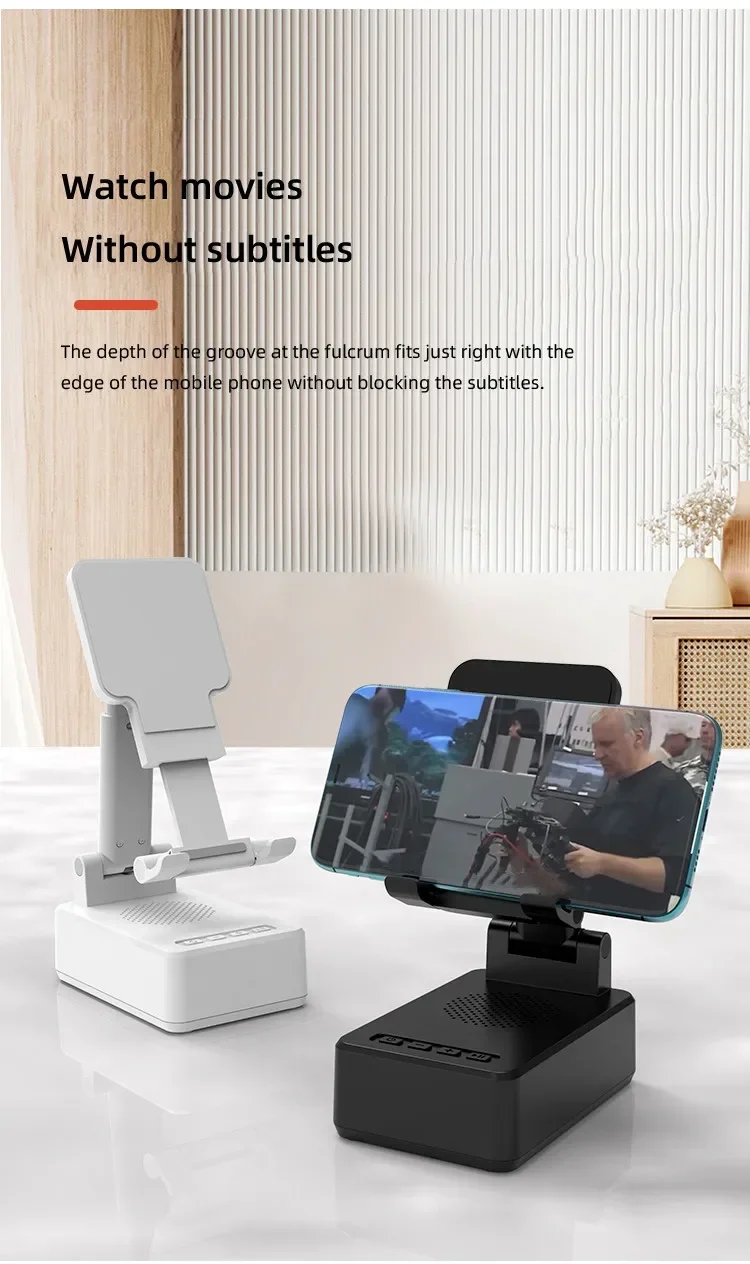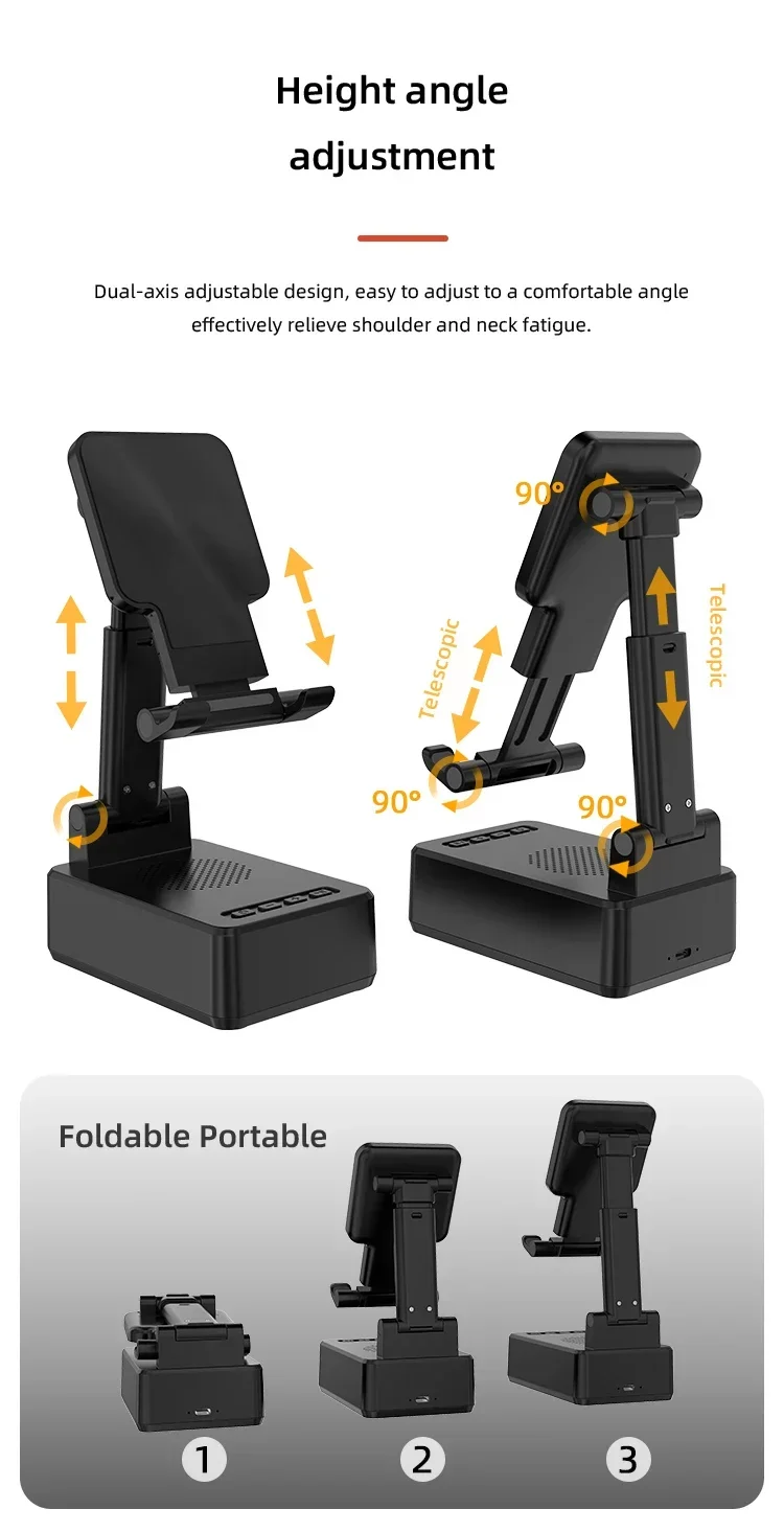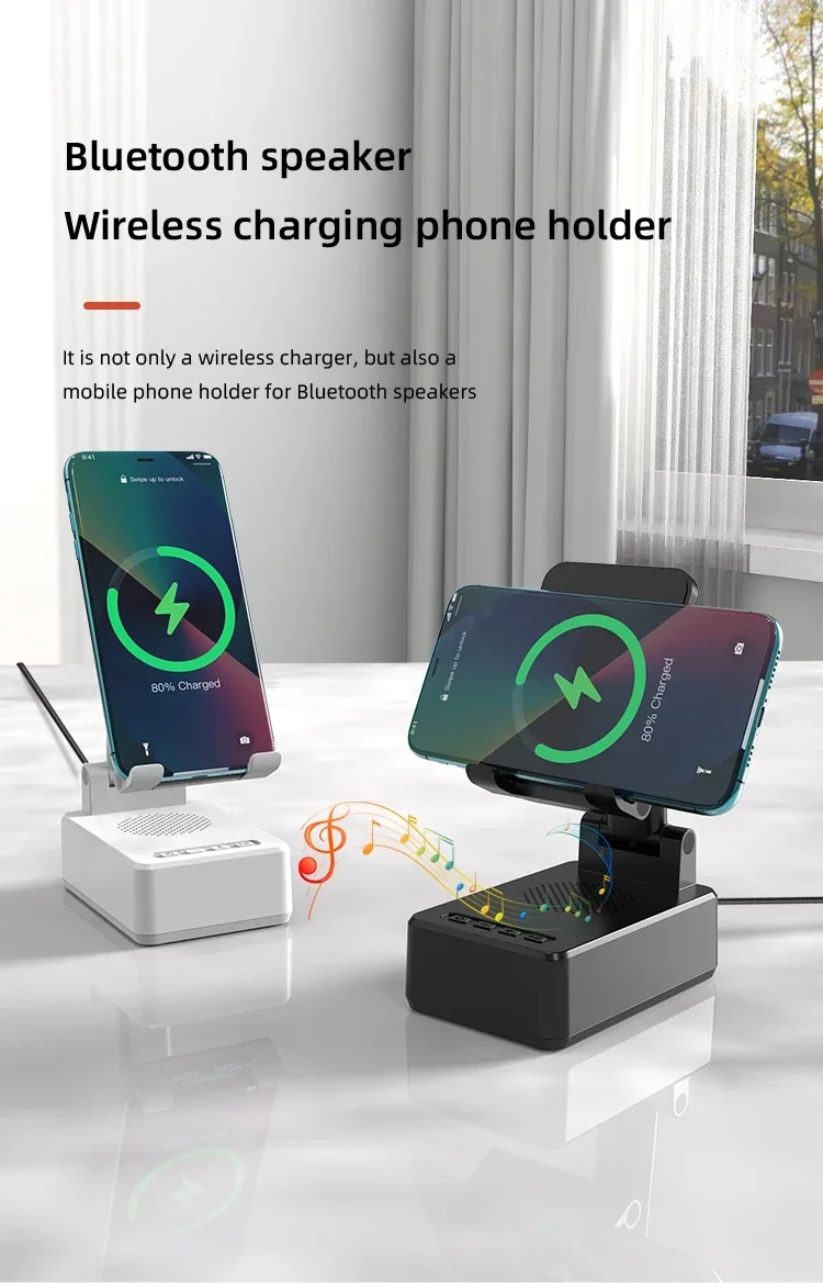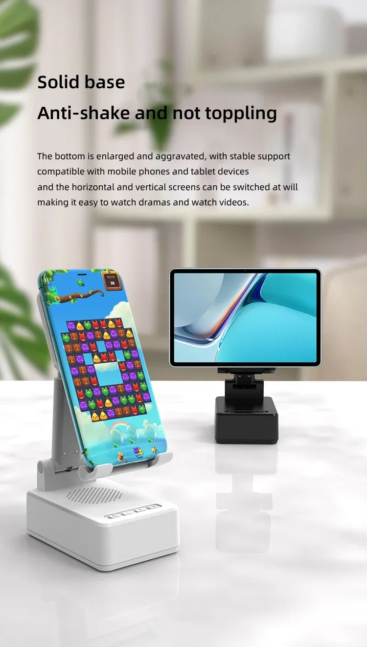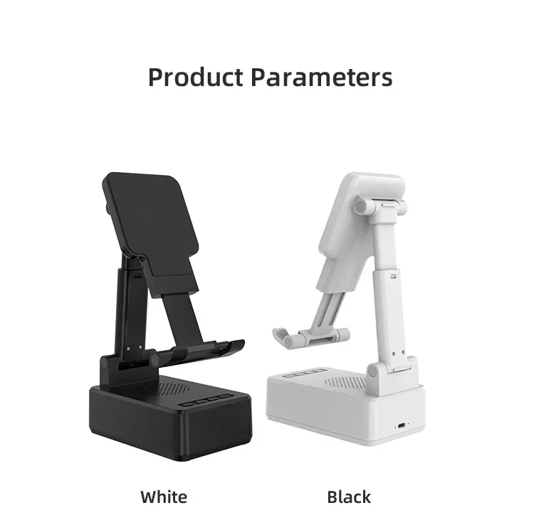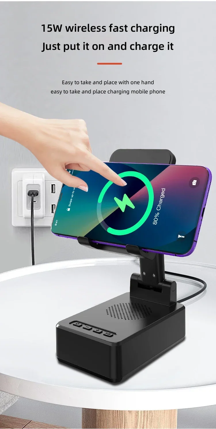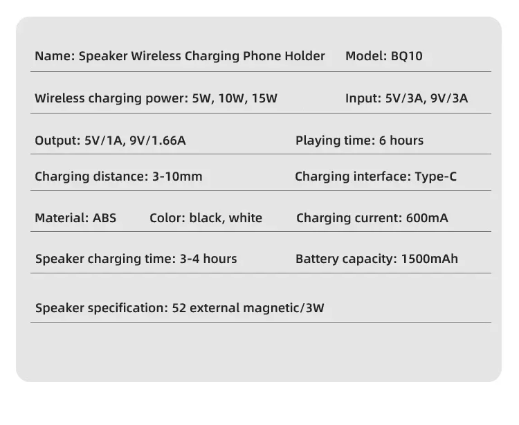 Confirme que sus teléfonos admiten la carga inalámbrica si desea utilizar la función de carga inalámbrica. Carga inalámbrica de 15W: puede cargar todos los teléfonos que admiten cargadores inalámbricos, confirme que sus teléfonos admiten cargadores inalámbricos antes de comprarlos. Amplia compatibilidad: este soporte para teléfono móvil es adecuado para la mayoría de las tabletas de teléfonos inteligentes de 4-13 pulgadas y lectores electrónicos como iPhone, iPad, e-reader, Switch, etc. Soporte con altavoz Bluetooth: este soporte tiene una versión Bluetooth 5,0 integrada, que puede conectar fácilmente su teléfono/tableta para reproducir música/vídeo, es la mejor opción para que liberes tus manos mientras ves videos desde tu teléfono. Ángulo de soporte ajustable: el soporte del teléfono móvil se puede ajustar desde múltiples ángulos para satisfacer sus necesidades de visión desde diferentes ángulos. Y su almohadilla de goma antideslizante evita que su dispositivo se deslice accidentalmente. Opción de regalo ideal: el creativo y práctico soporte para teléfono con altavoz Bluetooth es sin duda el regalo ideal para familiares o amigos para Navidad o cumpleaños. 6-12 HORAS DE TIEMPO DE TRABAJO CONTINUO: Este altavoz Bluetooth está equipado con una batería de 1200 mAh que puede seguir funcionando durante 6-12 horas dependiendo del volumen de su reproducción. Especificaciones Tipo: Soporte de cargador inalámbrico plegable con Altavoz Bluetooth Salida De Teléfono: 5W/7,5 W/10W/15W Interfaz: Paquete incluido: 1 soporte inalámbrico para cargador; 1 manual de usuario; 1 cable de carga tipo C de 1m. NOTA: Si desea cargar verticalmente, tire del soporte hacia la parte inferior y luego coloque su teléfono para la carga inalámbrica. De lo contrario, solo se admite la carga inalámbrica horizontal.