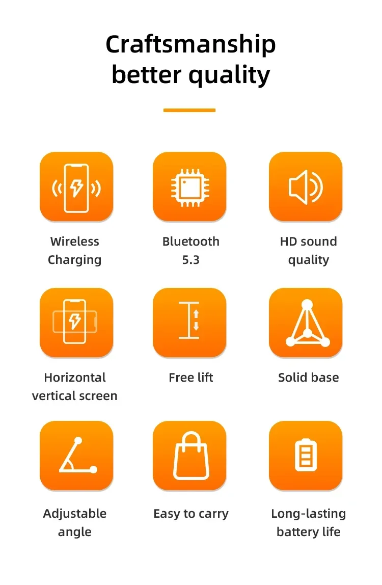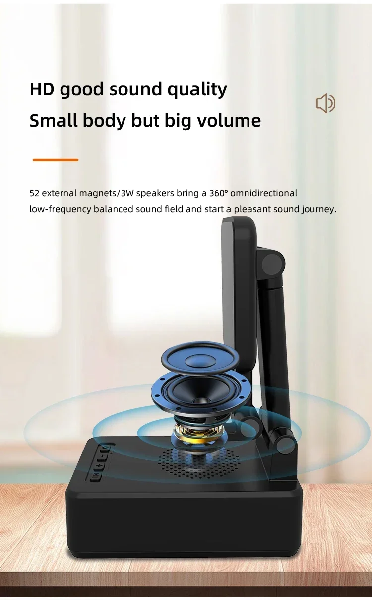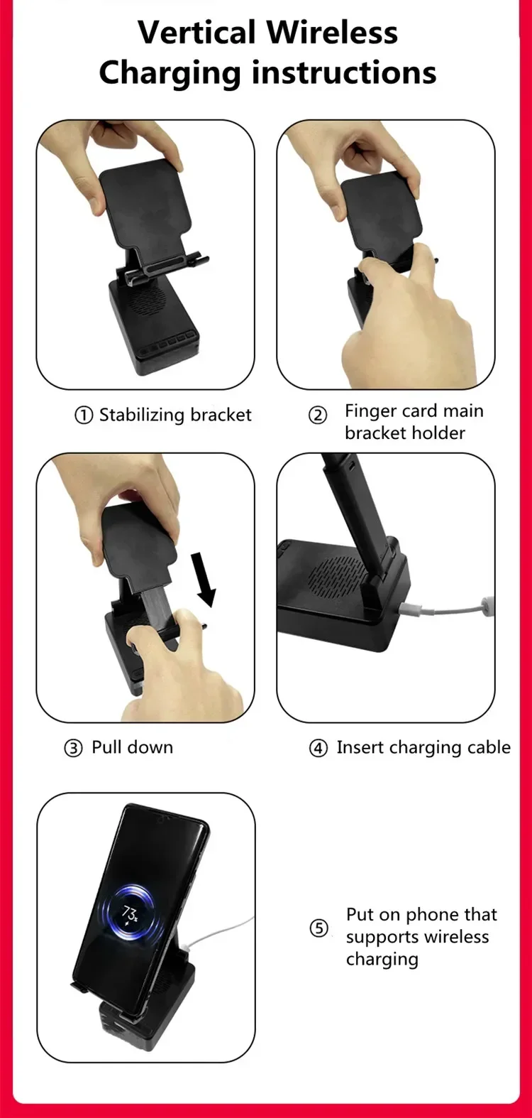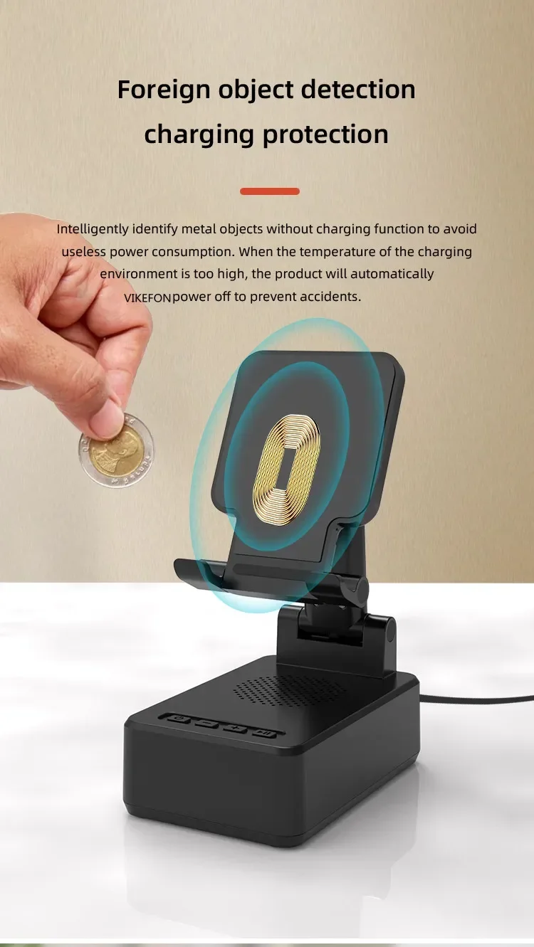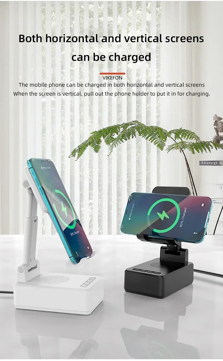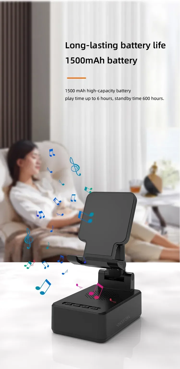 Confirme que sus teléfonos admiten la carga inalámbrica si desea utilizar la función de carga inalámbrica. Carga inalámbrica de 15W: puede cargar todos los teléfonos que admiten cargadores inalámbricos, confirme que sus teléfonos admiten cargadores inalámbricos antes de comprarlos. Amplia compatibilidad: este soporte para teléfono móvil es adecuado para la mayoría de las tabletas de teléfonos inteligentes de 4-13 pulgadas y lectores electrónicos como iPhone, iPad, e-reader, Switch, etc. Soporte con altavoz Bluetooth: este soporte tiene una versión Bluetooth 5,0 integrada, que puede conectar fácilmente su teléfono/tableta para reproducir música/vídeo, es la mejor opción para que liberes tus manos mientras ves videos desde tu teléfono. Ángulo de soporte ajustable: el soporte del teléfono móvil se puede ajustar desde múltiples ángulos para satisfacer sus necesidades de visión desde diferentes ángulos. Y su almohadilla de goma antideslizante evita que su dispositivo se deslice accidentalmente. Opción de regalo ideal: el creativo y práctico soporte para teléfono con altavoz Bluetooth es sin duda el regalo ideal para familiares o amigos para Navidad o cumpleaños. 6-12 HORAS DE TIEMPO DE TRABAJO CONTINUO: Este altavoz Bluetooth está equipado con una batería de 1200 mAh que puede seguir funcionando durante 6-12 horas dependiendo del volumen de su reproducción. Especificaciones Tipo: Soporte de cargador inalámbrico plegable con Altavoz Bluetooth Salida De Teléfono: 5W/7,5 W/10W/15W Interfaz: Paquete incluido: 1 soporte inalámbrico para cargador; 1 manual de usuario; 1 cable de carga tipo C de 1m. NOTA: Si desea cargar verticalmente, tire del soporte hacia la parte inferior y luego coloque su teléfono para la carga inalámbrica. De lo contrario, solo se admite la carga inalámbrica horizontal.
