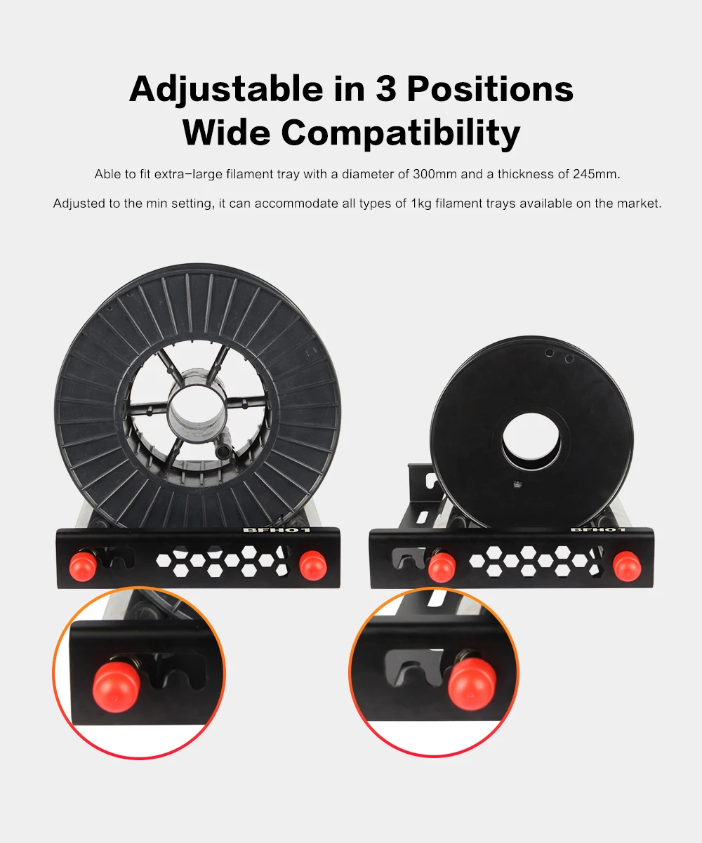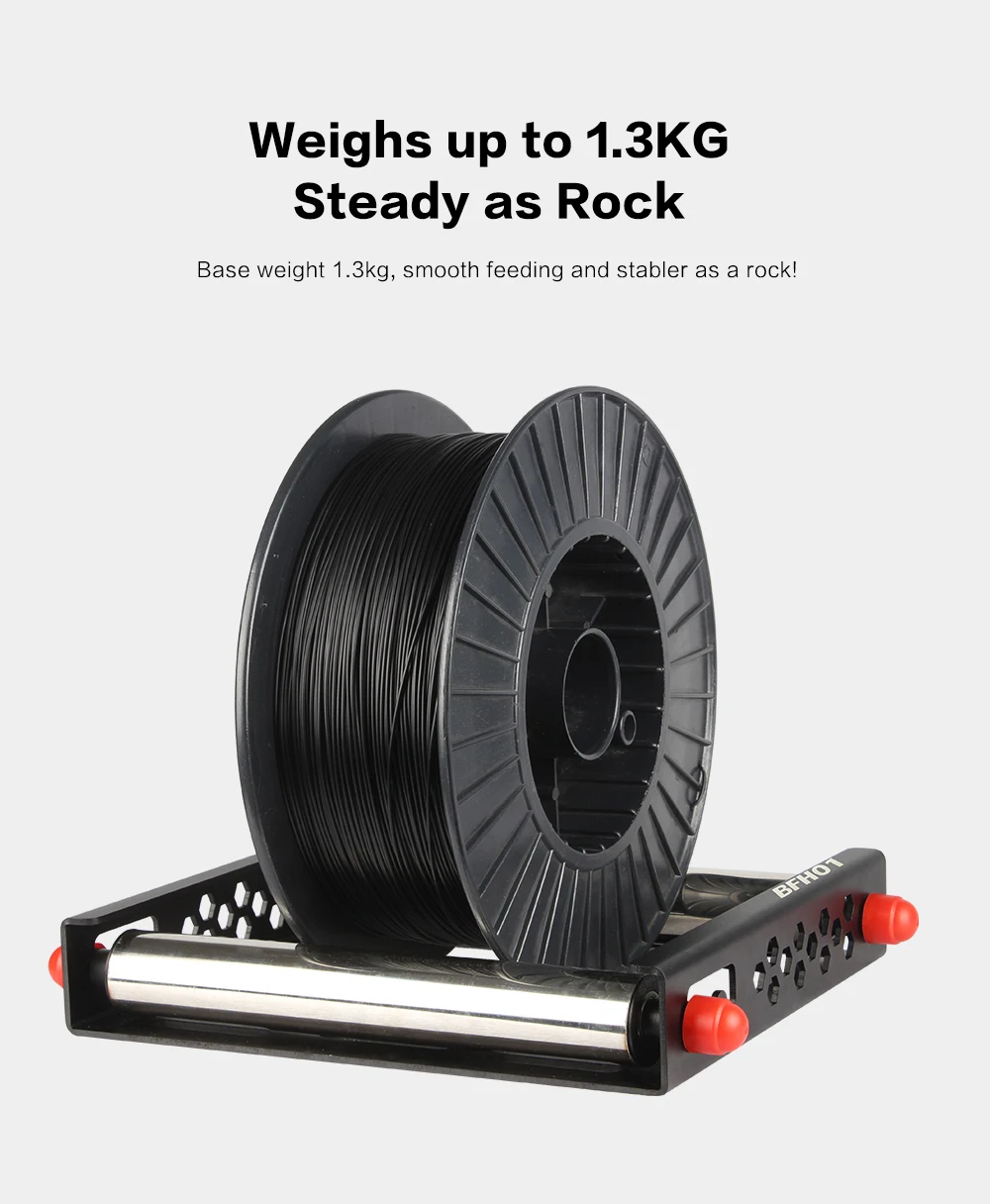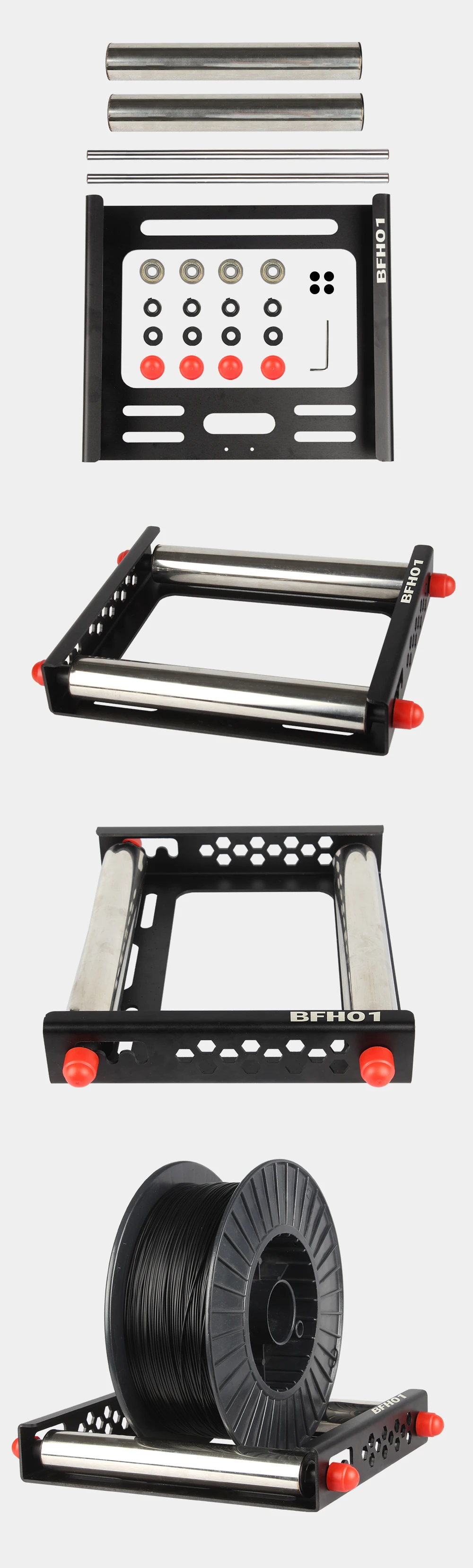 ¡El soporte de material BFH01 es realmente bueno para grandes rollos de consumibles! Otros soportes disponibles comercialmente suelen ser de solo 100g a 200g y es probable que se arrastren al alimentar material. Pero el soporte de stock BFH01 en sí pesa 1,3 kg y es todo metal. El Marco está plegado a partir de una placa de aleación de aluminio de 3mm de espesor, que está ahuecada en varios lugares por razones estéticas y para reducir los costes de transporte, de lo contrario el peso del marco sería de 3,2 kg. Rodillo en el soporte con un diámetro de tubo de acero inoxidable de 38mm, el eje de rodadura interno utiliza cojinetes de transmisión y eje de metal auxiliar de 8mm de diámetro, alimentación más suave. Solo el coste de los materiales metálicos ha alcanzado los 14USD. Además, el marco del producto está pulido con arena y oxidado, hermoso y atmosférico. Es muy adecuado para rollos grandes de consumibles, como 3kg, 5kg, incluso 10kg no son ningún problema. Unas pocas palabras para describir que es muy estable, fuerte compatibilidad, cualquier consumible puede coincidir con el soporte.