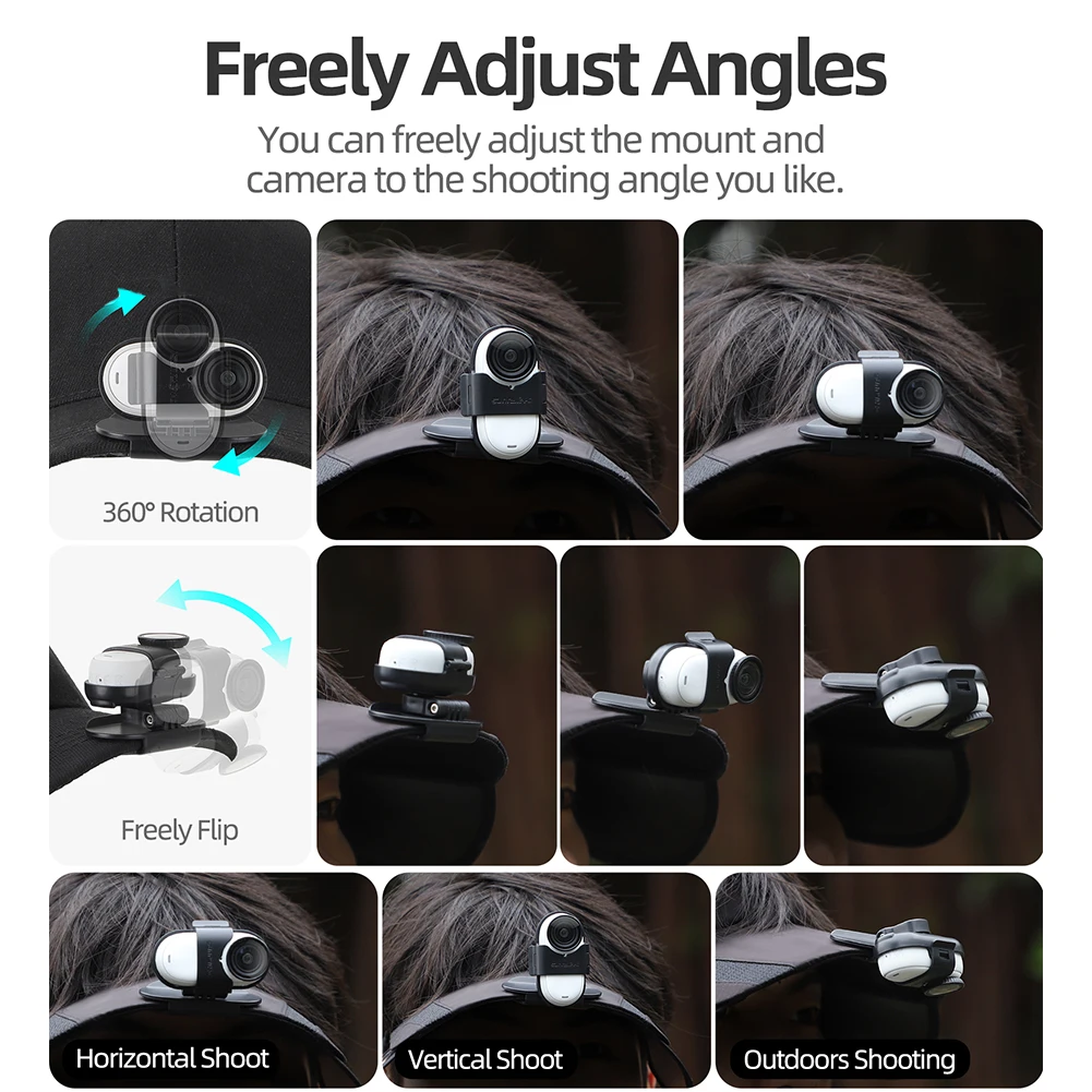 1. Flexible Shooting Angles: Featuring a unique 360° rotation design, this brim clip allows your camera to adjust freely, enabling front-to-back and side-to-side movements. Capture every exciting moment and unleash your creative perspective effortlessly.