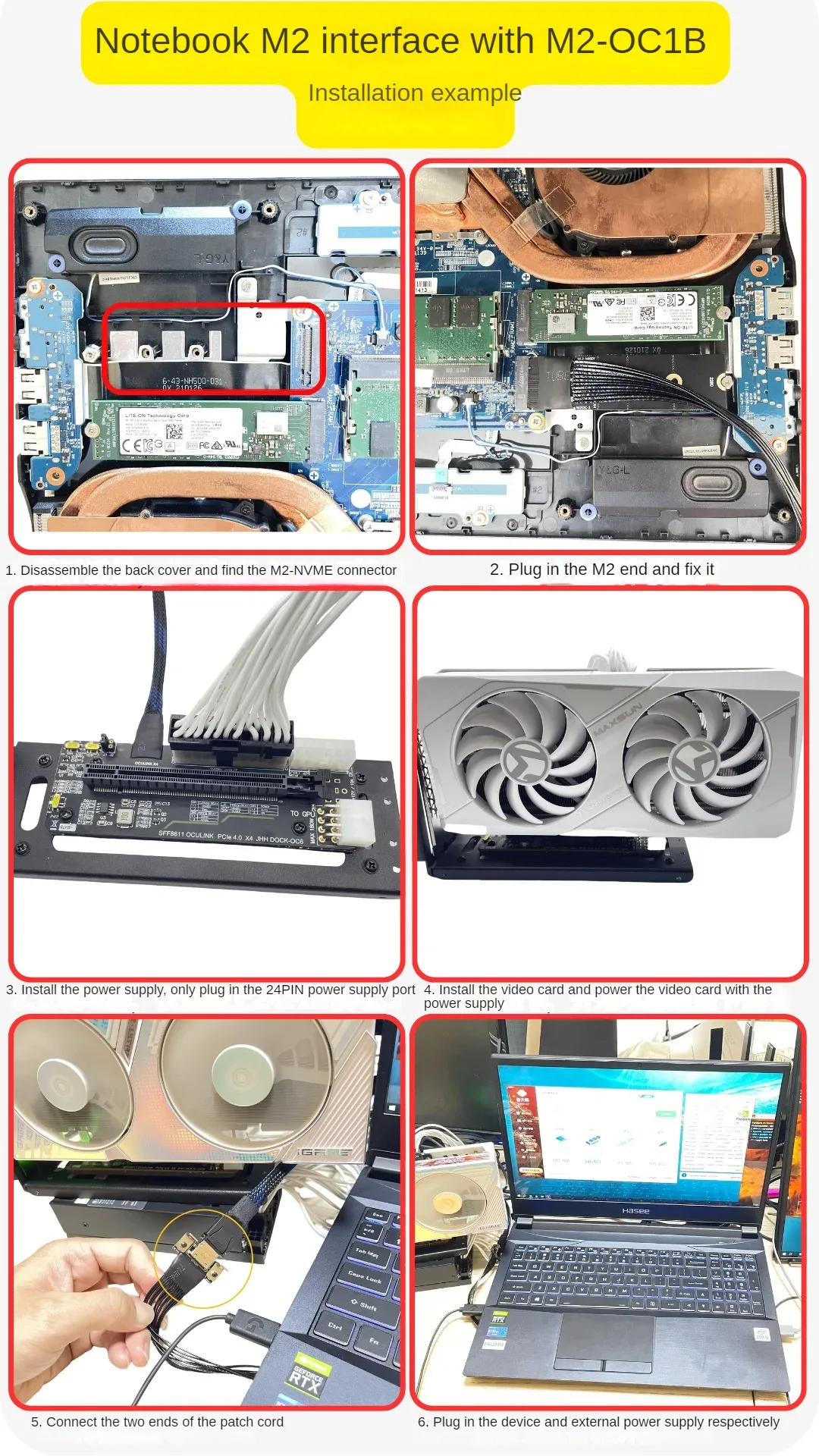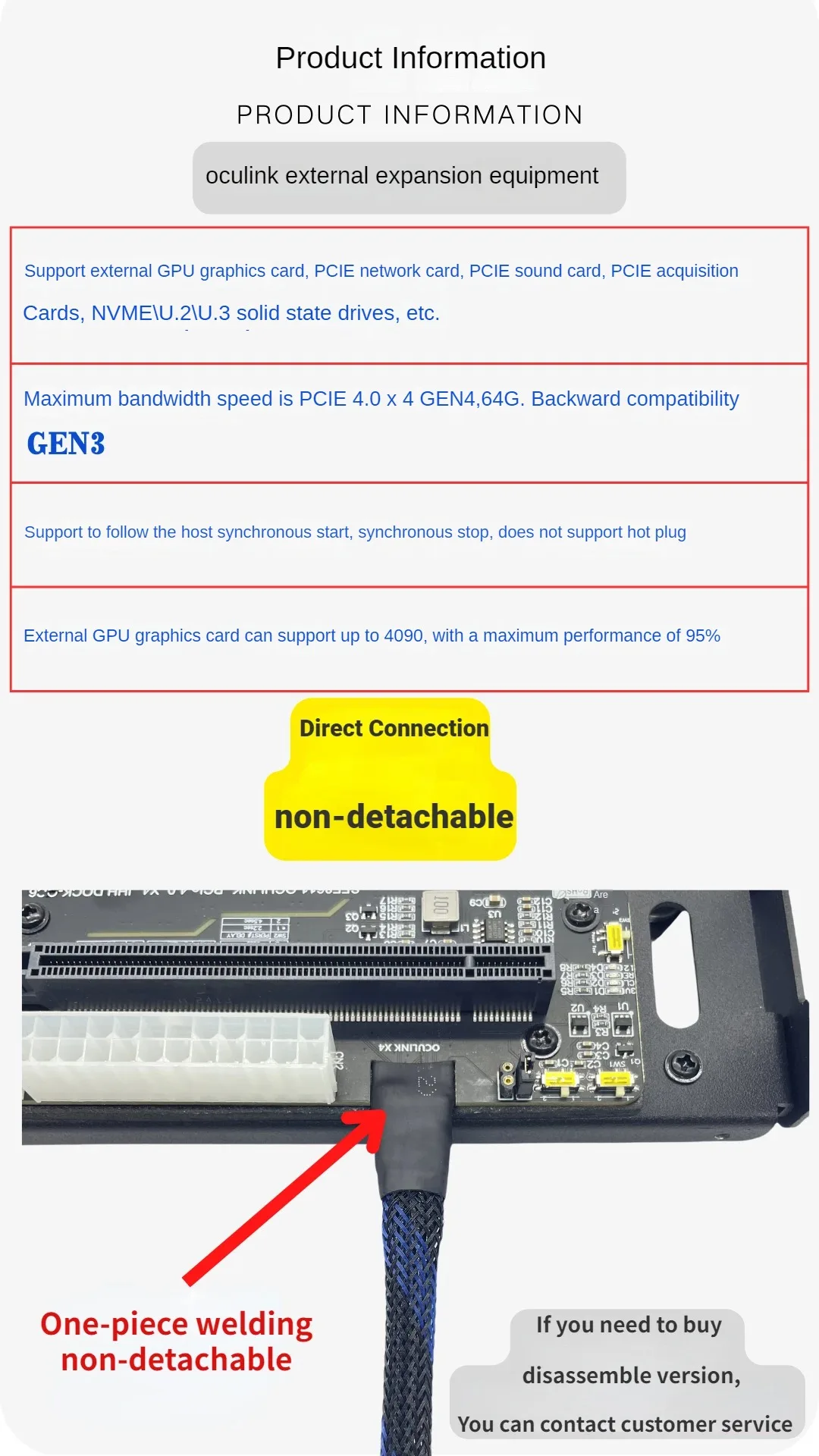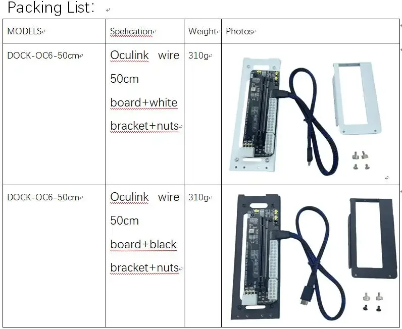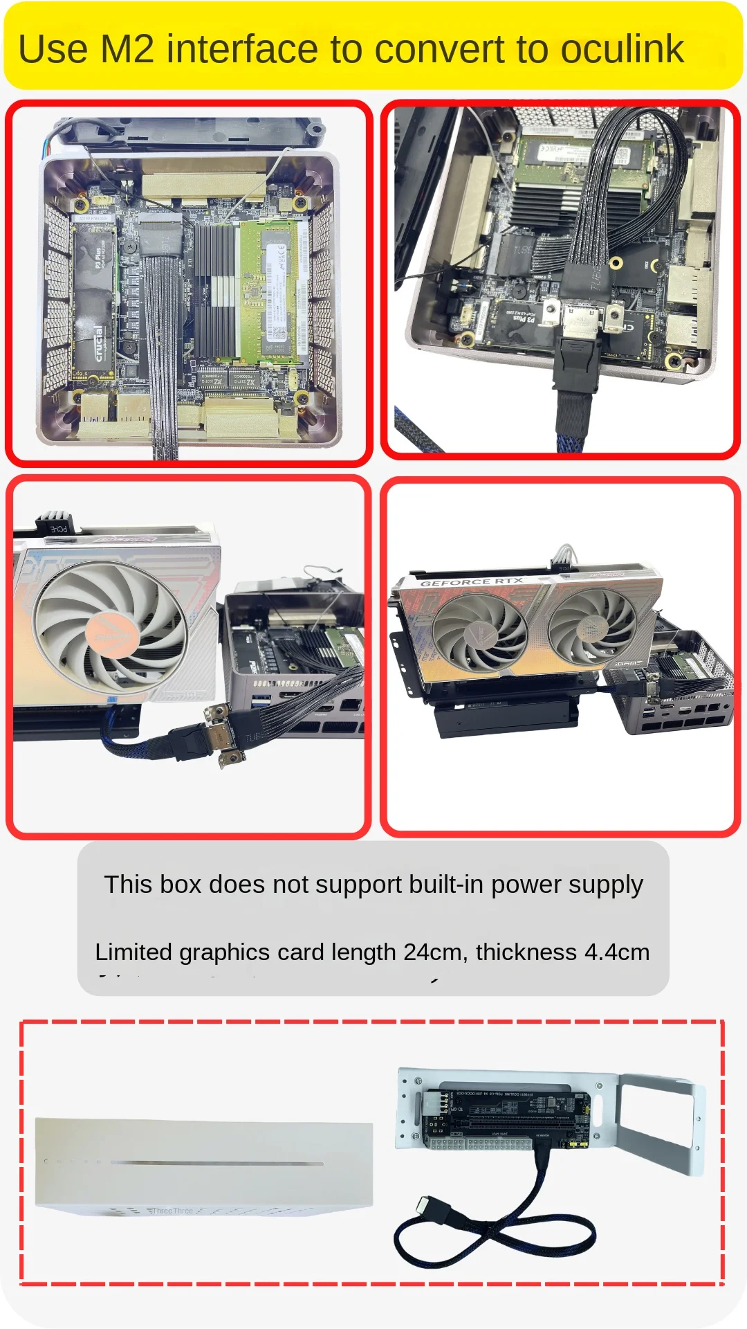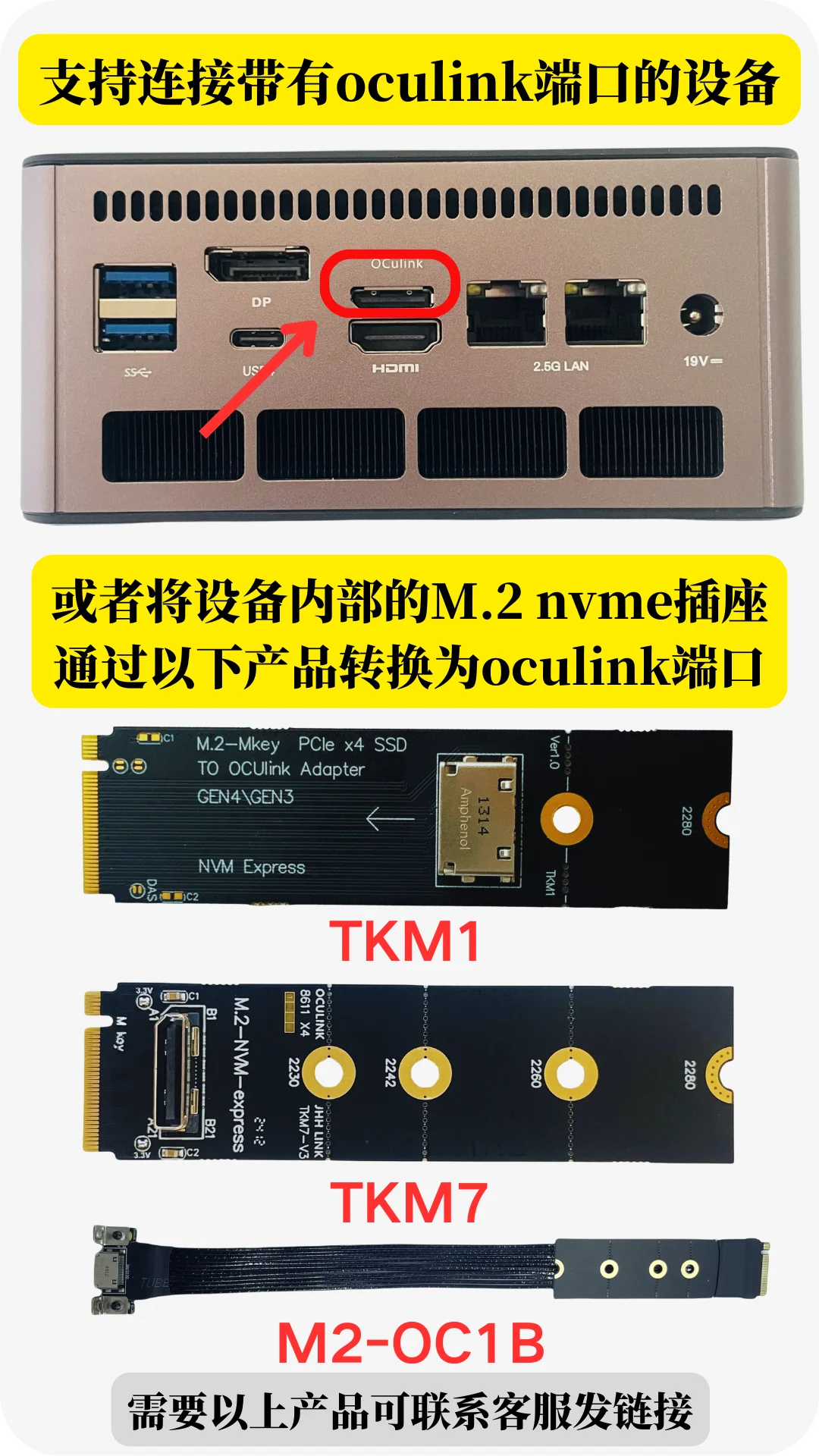 1.Dispositivo de extensión externa oculink, soporte para conectar con el puerto oculink o a través delM2OC1BCable de conversión Puerto M.2 en host del puerto oculink.