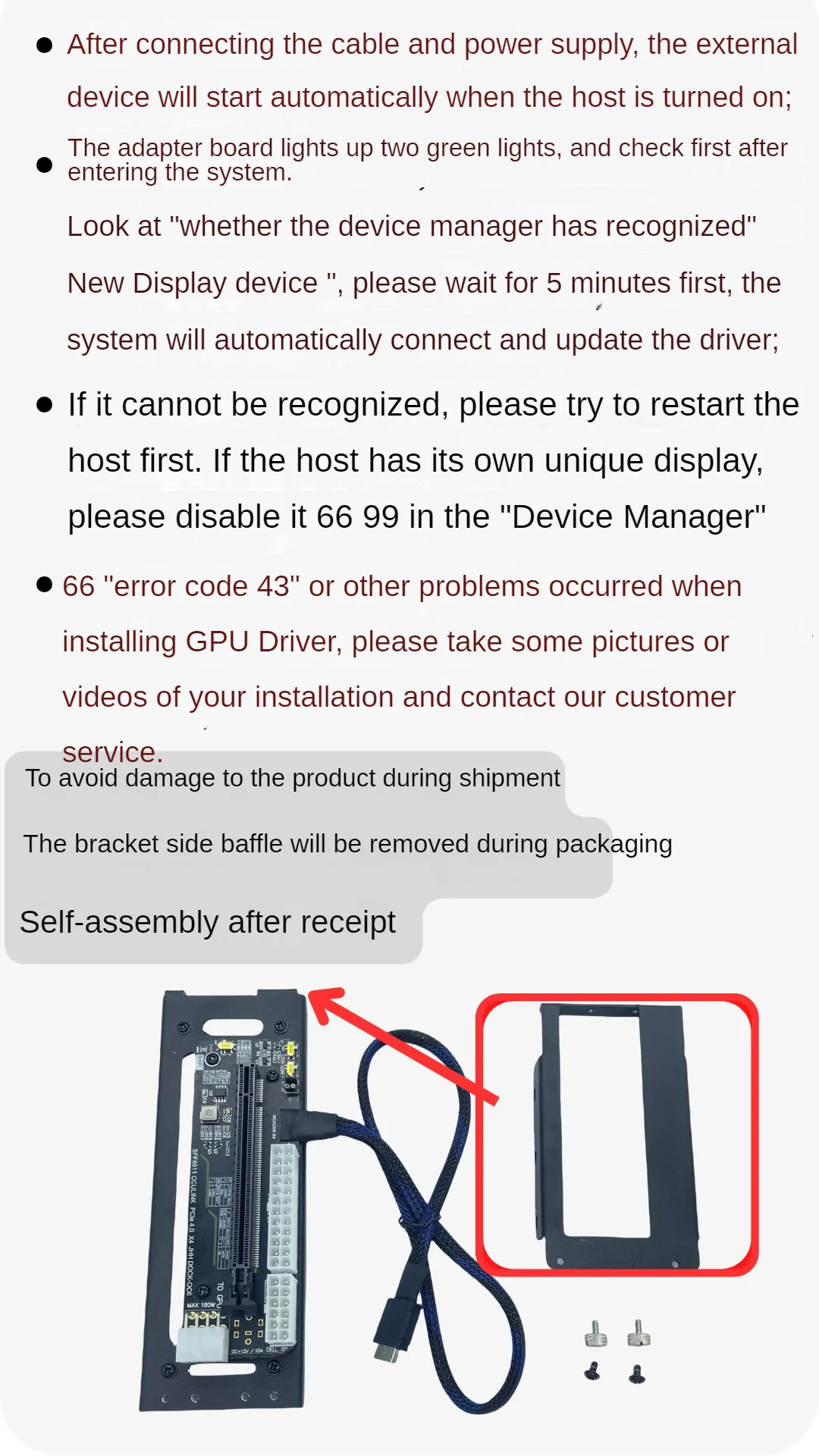 11.Después de conectar el cable y la fuente de alimentación, el dispositivo externo se inicia automáticamente después de encender el host y la placa de conversión enciende dos luces verdes. Después de ingresar al sistema, verifique si el "Nuevo dispositivo de visualización" está reconocido en el "Gerente de dispositivos". Si no, reinicie primero el host. Si el host tiene su propia pantalla única, desactivelo en Administrador de dispositivos. "Código de error 43" u otros problemas ocurren al instalar el controlador GPU, tome algunas fotografías o videos de su instalación y comuníquese con nuestro servicio de atención al cliente.