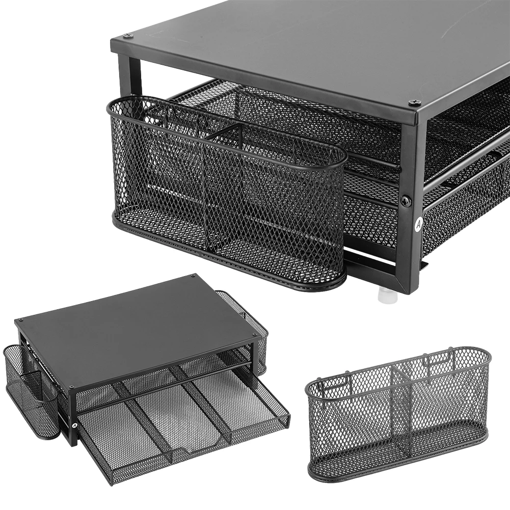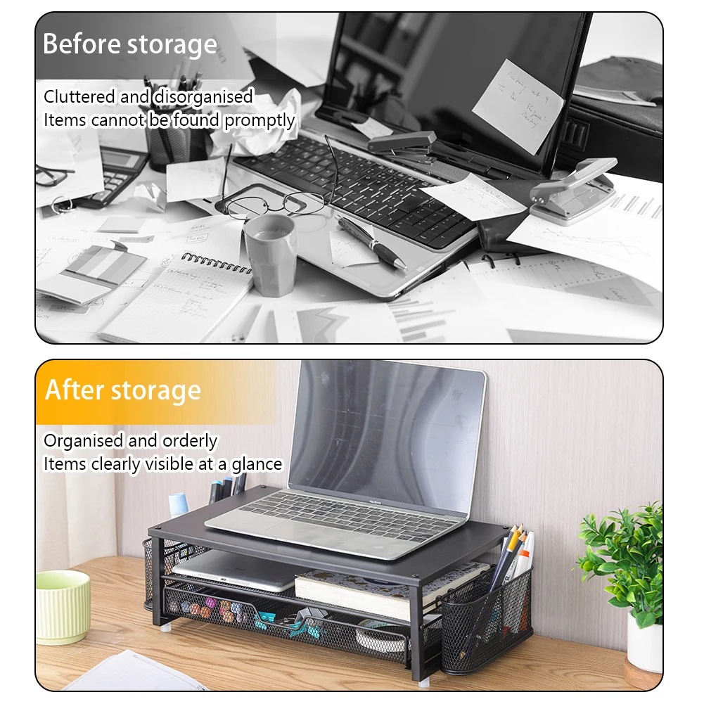 2.Versátil y práctico:Este organizador de escritorio sirve como soporte para computadora, soporte de escritorio para computadora portátil o estación de trabajo, y admite artículos como impresoras, escáneres y más de hasta 15 kg.No sólo un elevador, es un organizador de oficina con cajones de almacenamiento para maquillaje o artículos de papelería.