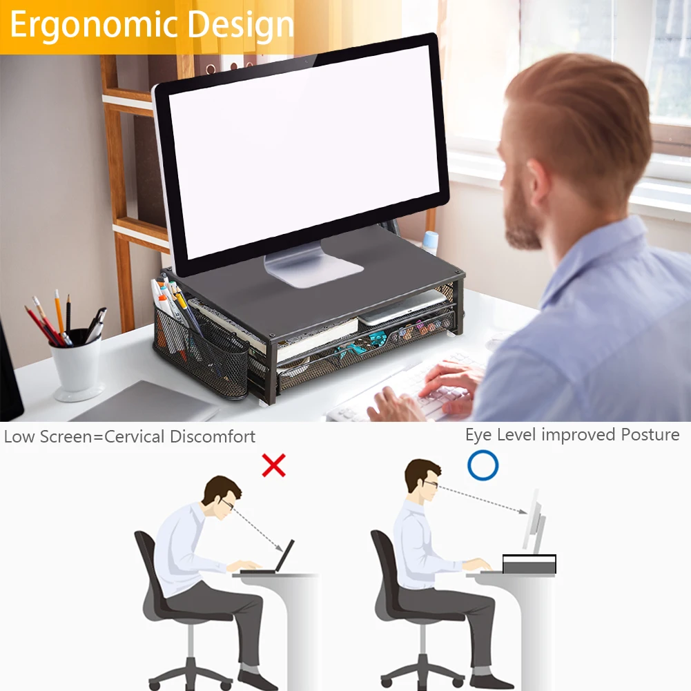 4.Diseño mejorado:El elevador del monitor de escritorio eleva la pantalla de su computadora portátil a un ángulo de visión óptimo, promoviendo una mejor postura y reduciendo la fatiga visual del cuello, la espalda y los ojos para una comodidad ergonómica.