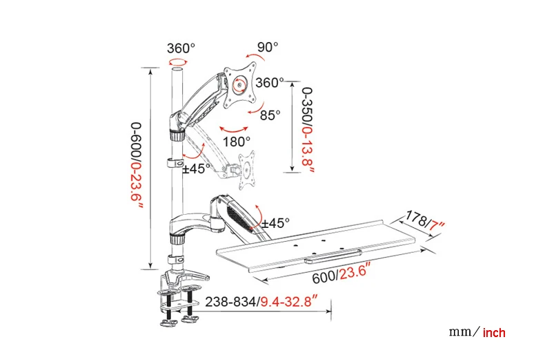 Monitor ergonómico de aleación de aluminio con resorte de Gas y soporte para teclado