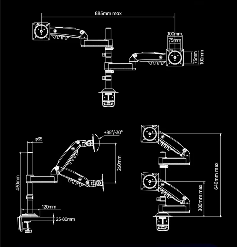 * Modelo n. °: * Adecuado para LCD/monitor de 17 "-27" * Con estructura de prensa de aire, fácil de mover hacia arriba/abajo * Rotar en 360, * Inclinación arriba/abajo: 85 °/-30 ° * Giratorio: 180 ° * Con sistema de cable para ocultar los cables * Carga: 2-9kg cada brazo (asegúrese de que su pantalla esté dentro de este rango, o el resorte de gas del soporte no podría funcionar) * VESA : 75/100MM * Incluye base de abrazadera y base de arandela juntos: Base de ojal adecuada para diámetro de orificio de 10mm-50mm, espesor de escritorio: 20-90mm Base de abrazadera: Grosor de escritorio entre 25-80mm