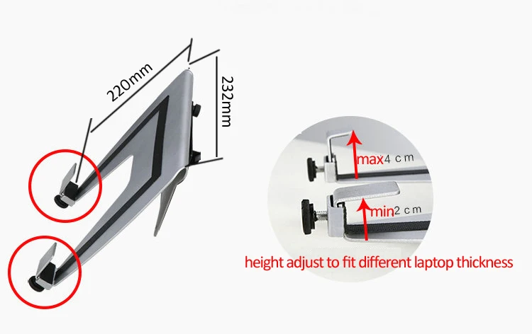Adecuado para portátiles con un grosor entre 20mm y 40mm (portátil 1), 5mm-21mm (portátil 2)