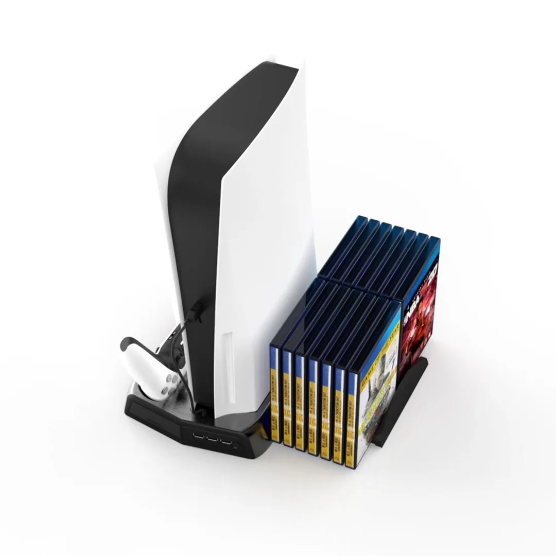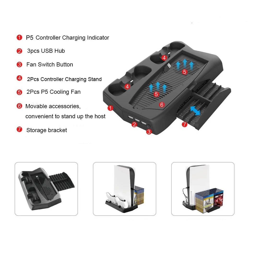 Para PS5 soporte de estación de base de carga de controlador Dual con ventilador de refrigeración y soporte de almacenamiento de disco de juego para Play-Station5