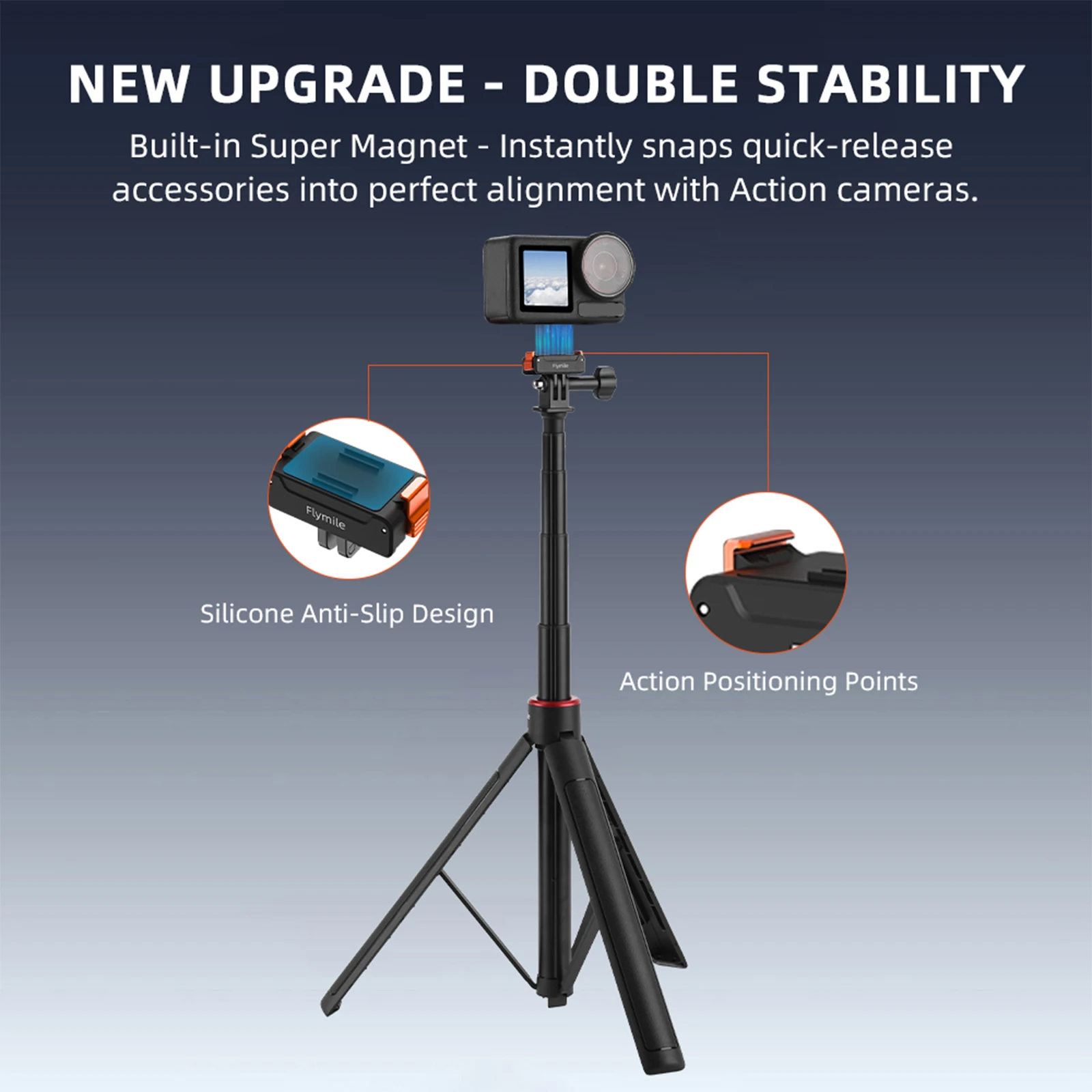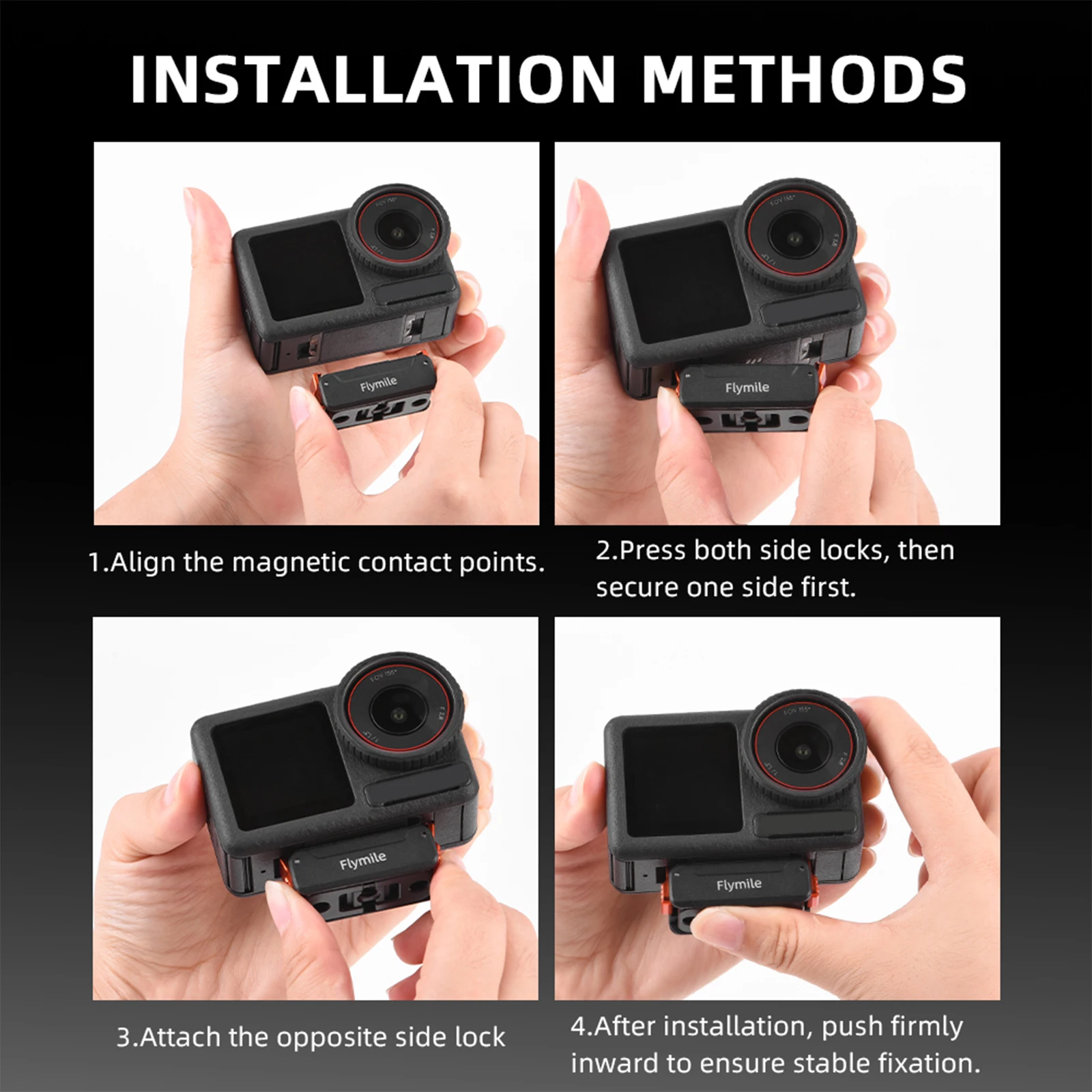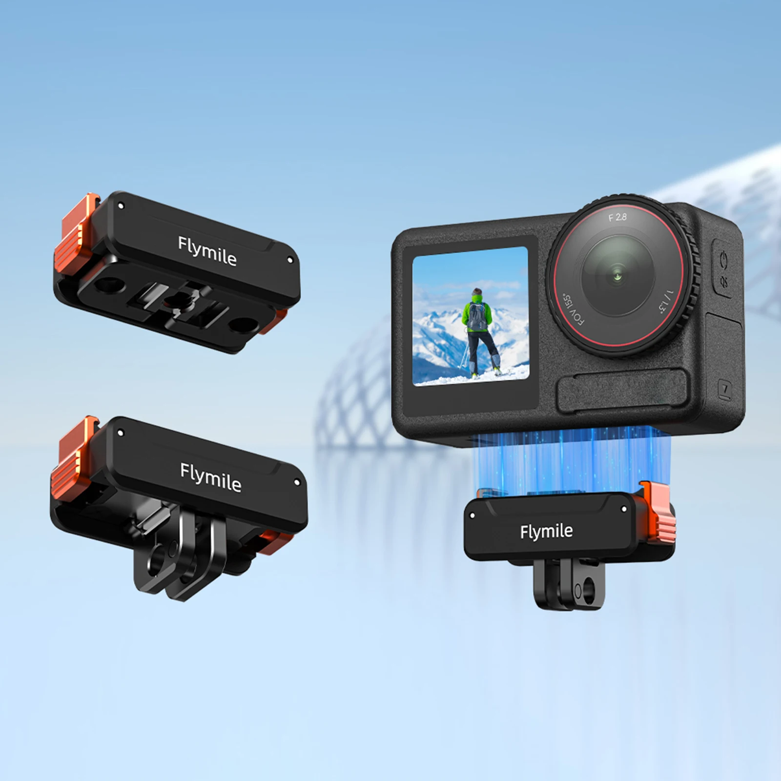 Características:1.Accesorio magnético seguro:El soporte de liberación rápida utiliza un soporte adaptador magnético potente combinado con un bloqueo de garra, lo que garantiza que Action5Pro/4 permanezca seguro en su lugar para cada aventura sin moverse ni tambalearse.