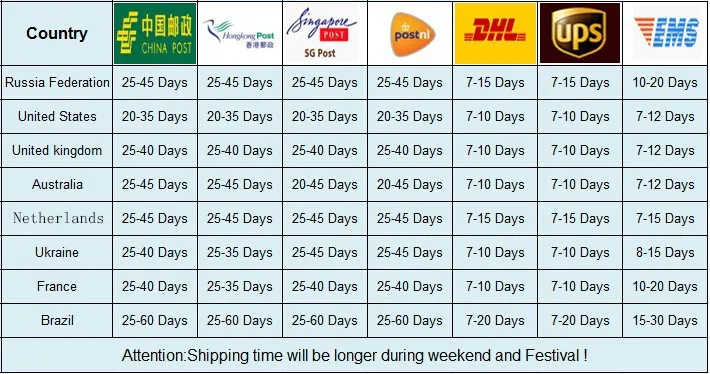 1. Asegúrese de que su dirección de envío sea correcta, no admitimos revisar la dirección.2. Envío gratuito a la mayoría de los países por correo aéreo registrado.3. Todos los paquetes se enviarán dentro de 3 días hábiles después de realizar el pago.