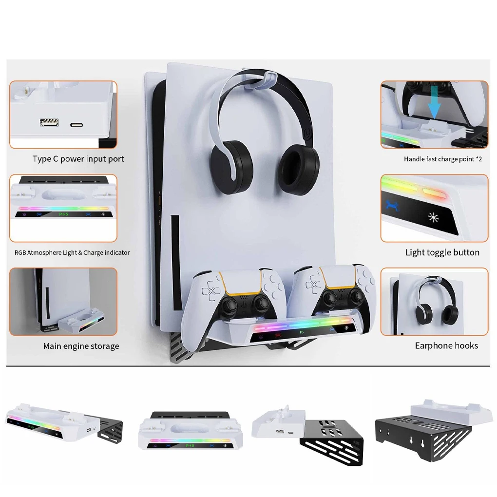 Equipado con tiras de luz RGB: mejore su configuración de juego con 9 efectos de iluminación diferentes en este kit de montaje en pared, compatible con PS5/PS5 Slim Disc y Digital Edition para una experiencia de juego única