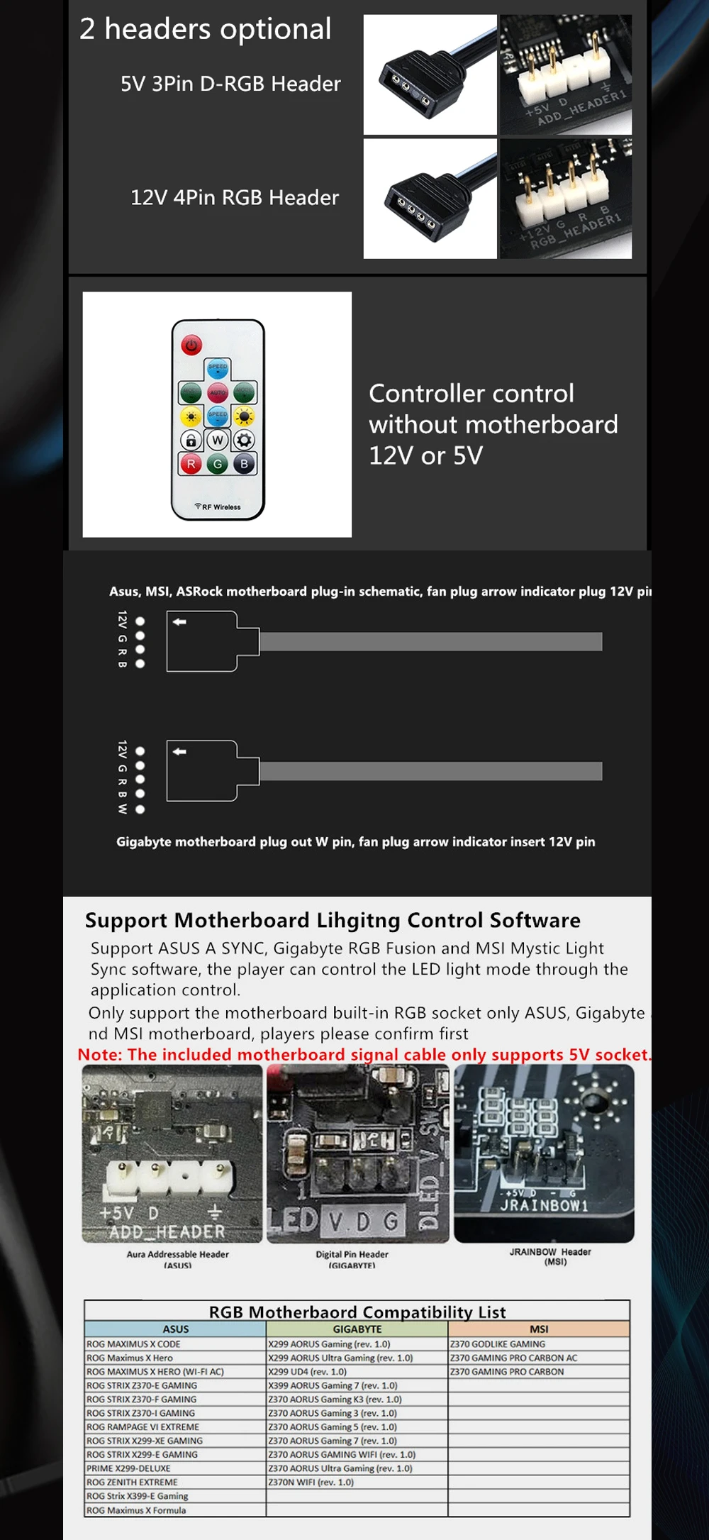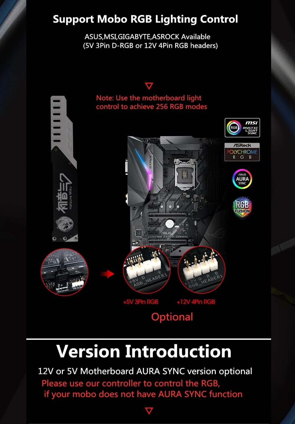 Características1. Material de aluminio y acrílico importado2. Luces LED de alta calidad3. Colorido RGB verdadero sinfonía de 16 colores4. Grabado de precisión de alta gama, nunca se quita la pinturaEstilo1. Modelos RGB-16 coloresGradiente, saltar, apagar las luces, siempre encendido, fijo, flash, brillo, control de velocidad y otras funciones (admite control remoto o sincronización de placa base)2. Sinfonía-16 coloresOriginario para traer 133 tipos de efectos de fantasía. Los efectos especiales y los cuchillos múltiples no se pueden escribir aquí. (múltiples excusas para satisfacerte)Nota: Se requieren 3 orificios de enroscar para brocas PCI (para chasis grande ATX, no se pueden instalar chasis pequeños)La Longitud del cable es de aproximadamente 30cm. Es adecuado para la posición de la interfaz de la esquina inferior izquierda de la placa base. En otros lugares, necesita tomar otro cable de extensión RGB.Compatible con el sistema de iluminación ASUS AURA. La siguiente barra de luz está conectada directamente a la interfaz de la placa base: