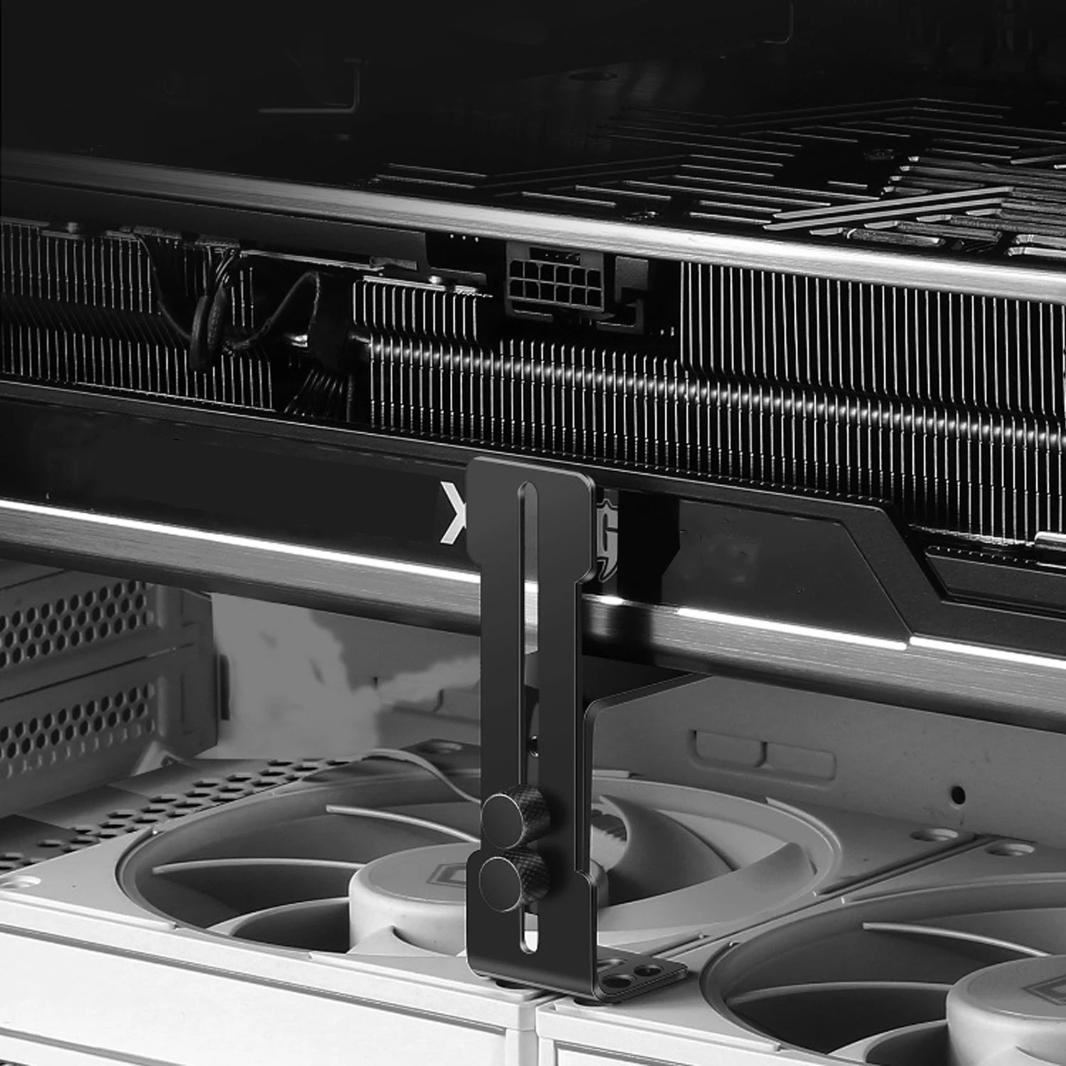 [Diseño funcional]: la función principal de este soporte es brindar soporte adicional para su tarjeta gráfica, evitando que se hunda o se doble bajo su propio peso.Esto ayuda a mantener la integridad de los componentes de la computadora y garantizar un rendimiento óptimo.