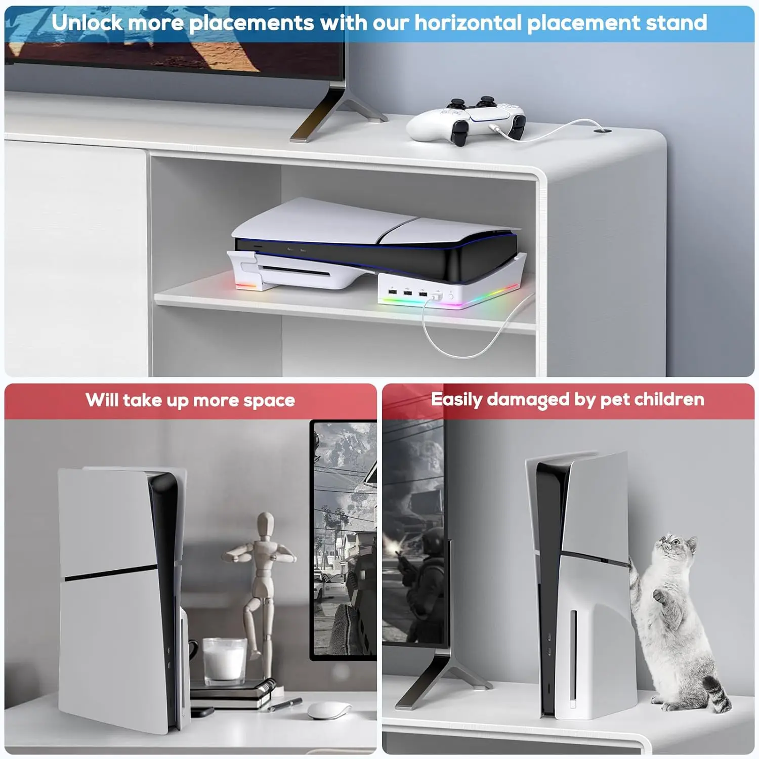 🌀【Soporte horizontal mejorado para consola PS5 SLIM】El soporte IPEGA es compatible con la NUEVA PlayStation 5 Slim Disc y la consola de edición digital 2023.Viene con 4 puertos de expansión USB para necesidades de carga y transmisión de datos;El diseño horizontal es más estable que el soporte vertical original, lo que ahorra espacio y aumenta el área de enfriamiento para acelerar la disipación de calor;Además, las luces ajustables de 14 colores también pueden hacer que disfrutes mejor del entorno de juego.📌 NOTA: Solo para consola PS5 Slim, NO para mayores.