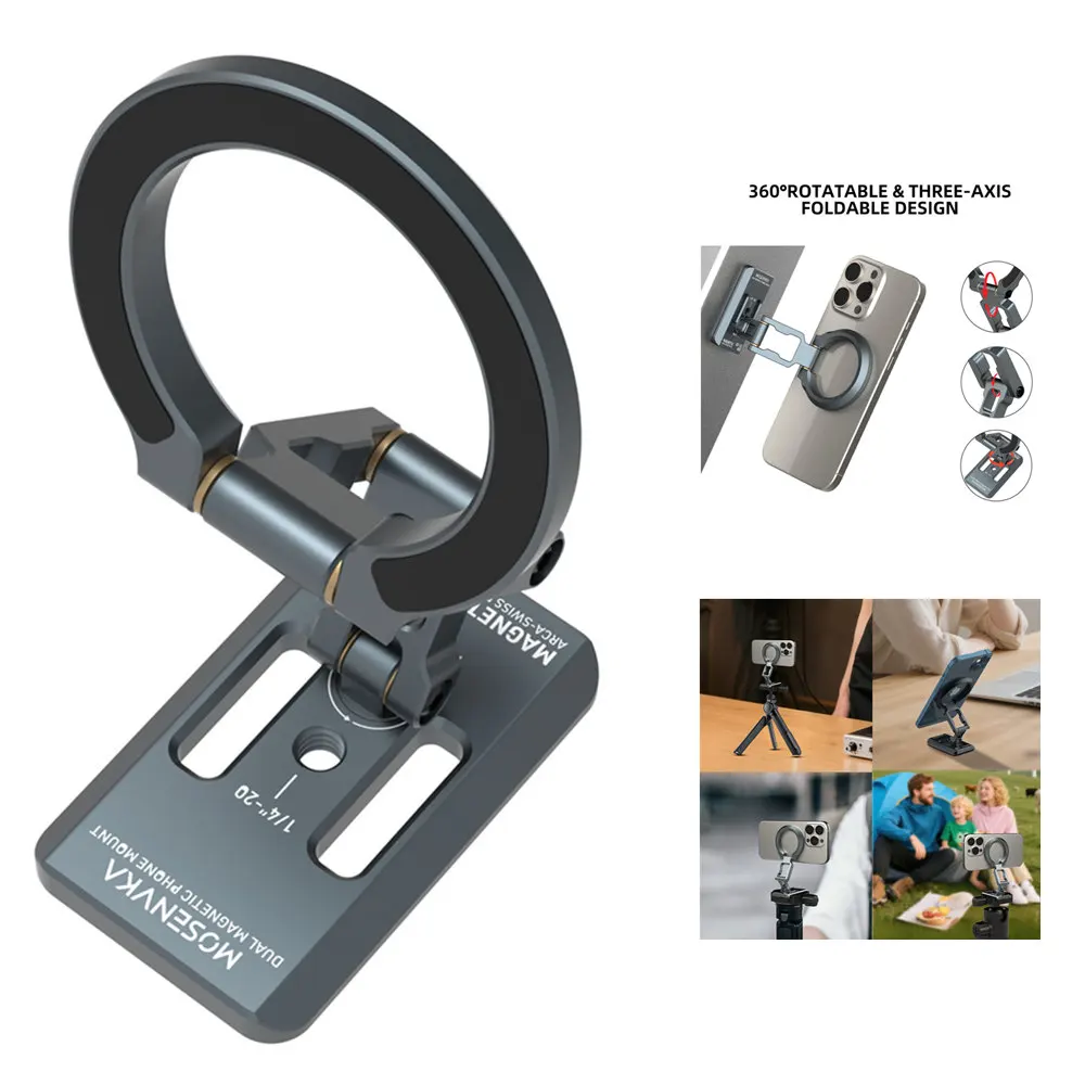 Soporte magnético doble para teléfono iPhone 16 15 14 13 12 Series con rosca 1/4''-20 Arca-swiss Pale 360° Soporte para teléfono de gimnasio giratorio y plegable de tres ejes