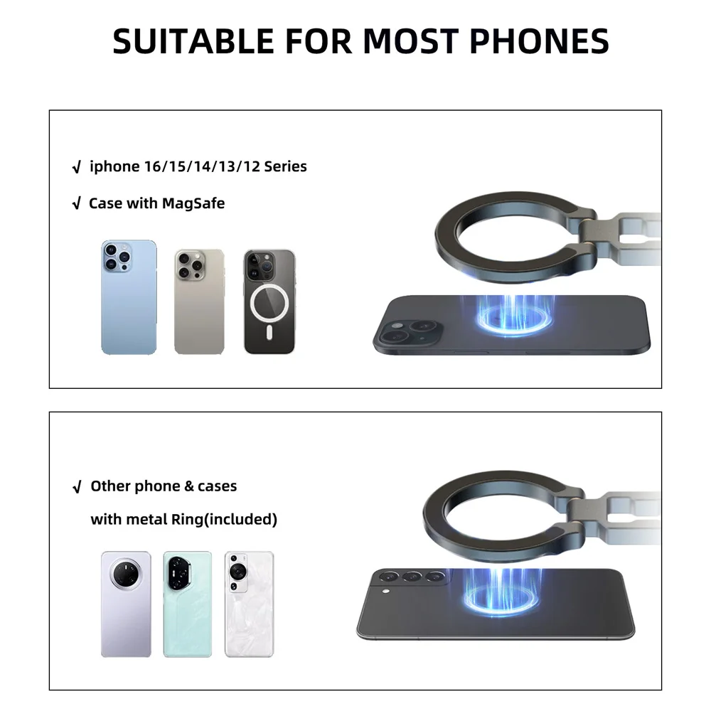 Este soporte para teléfono está diseñado específicamente para la serie iPhone 16/15/14/13/12, incluidas las fundas MagSafe y también es adecuado para otros teléfonos y estuches con anillo de metal, lo que garantiza un ajuste perfecto y un soporte confiable.