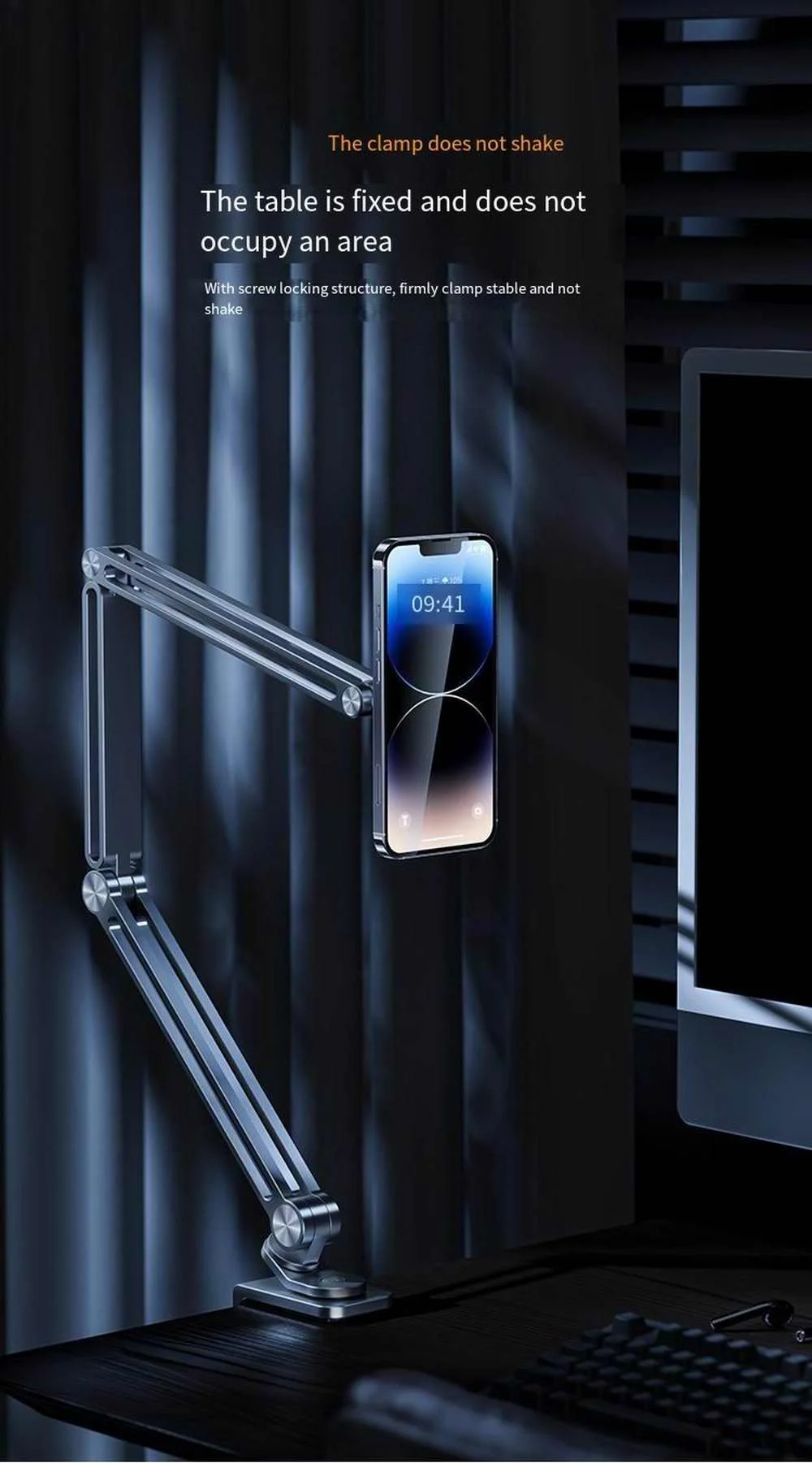 La abrazadera de escritorio soporta un máximo de 2 pulgadas o menos, cuando necesite ajustar la fuerza de las juntas, hágalas más apretadas, sueltas o bloqueadas