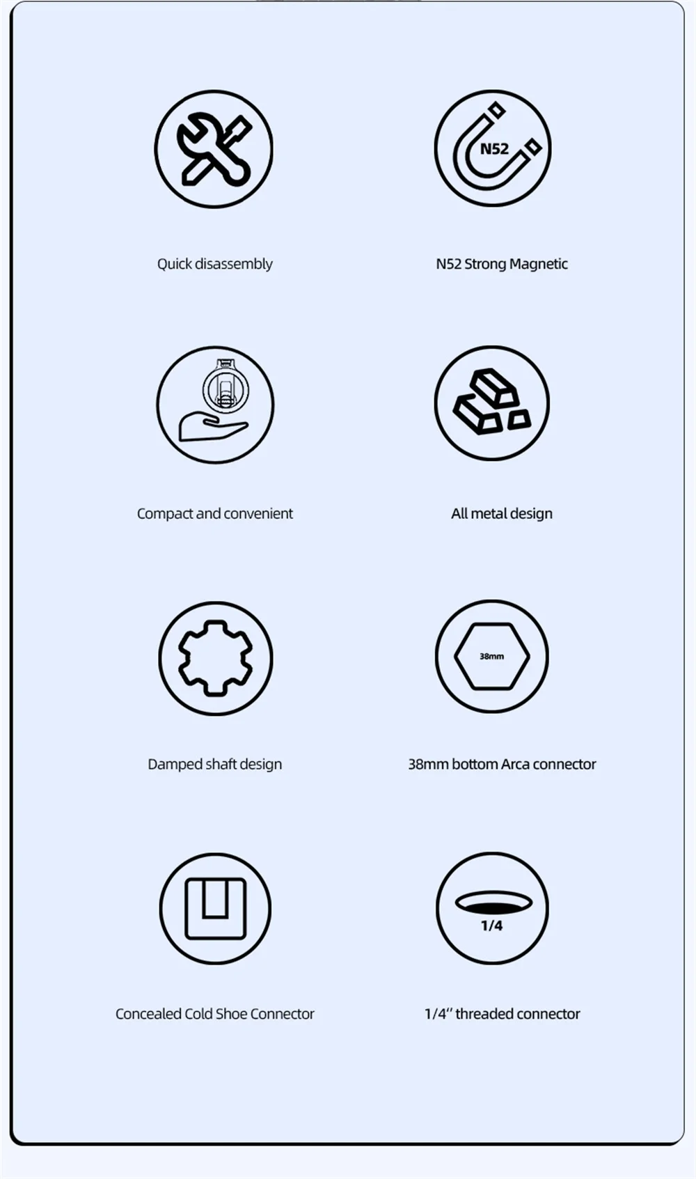 ¡Lleva la fotografía de tu teléfono al siguiente nivel con nuestro soporte magnético para teléfono con zapata fría MagSafe de liberación rápida!Hecho de aleación de aluminio totalmente metálica de primera calidad, este soporte sujeta de forma segura su teléfono en su lugar y al mismo tiempo brinda fácil acceso a su cámara y monitor.¡Con una montura Arca-Swiss de 38 mm, da rienda suelta a tu espíritu aventurero y captura el tiro perfecto en todo momento!