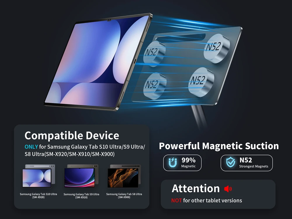 Aviso: Samsung Galaxy Tab S10 FE 10,9 pulgadas y Samsung Galaxy Tab S10 FE+ 13,1 pulgadas no pueden usar este soporte magnético. Confirme el modelo y el tamaño de su tableta antes de realizar un pedido.