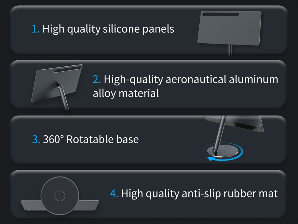 Soporte de aluminio robusto:Hecho de material de aluminio extremadamente duro y duradero, proporciona una gran estabilidad para soportar una tableta de forma agradable y sencilla.