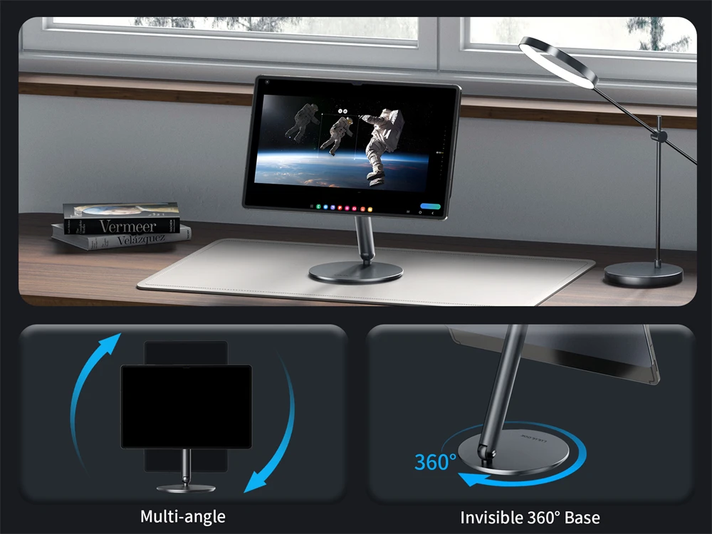 Plegable y ajustable en múltiples ángulos:Portátil Plegable 360° Diseño de base giratoria. Este soporte plegable para tableta de escritorio tiene dos bisagras, la bisagra superior ajusta el ángulo y lo hace fácilmente ajustable para los modos vertical y horizontal, la bisagra inferior ajusta la altura y está plegada.Puede combinar fácilmente el mejor nivel de los ojos, para que pueda mantener una postura cómoda al pintar, tomar notas, jugar y ver videos/fotos de cocina.