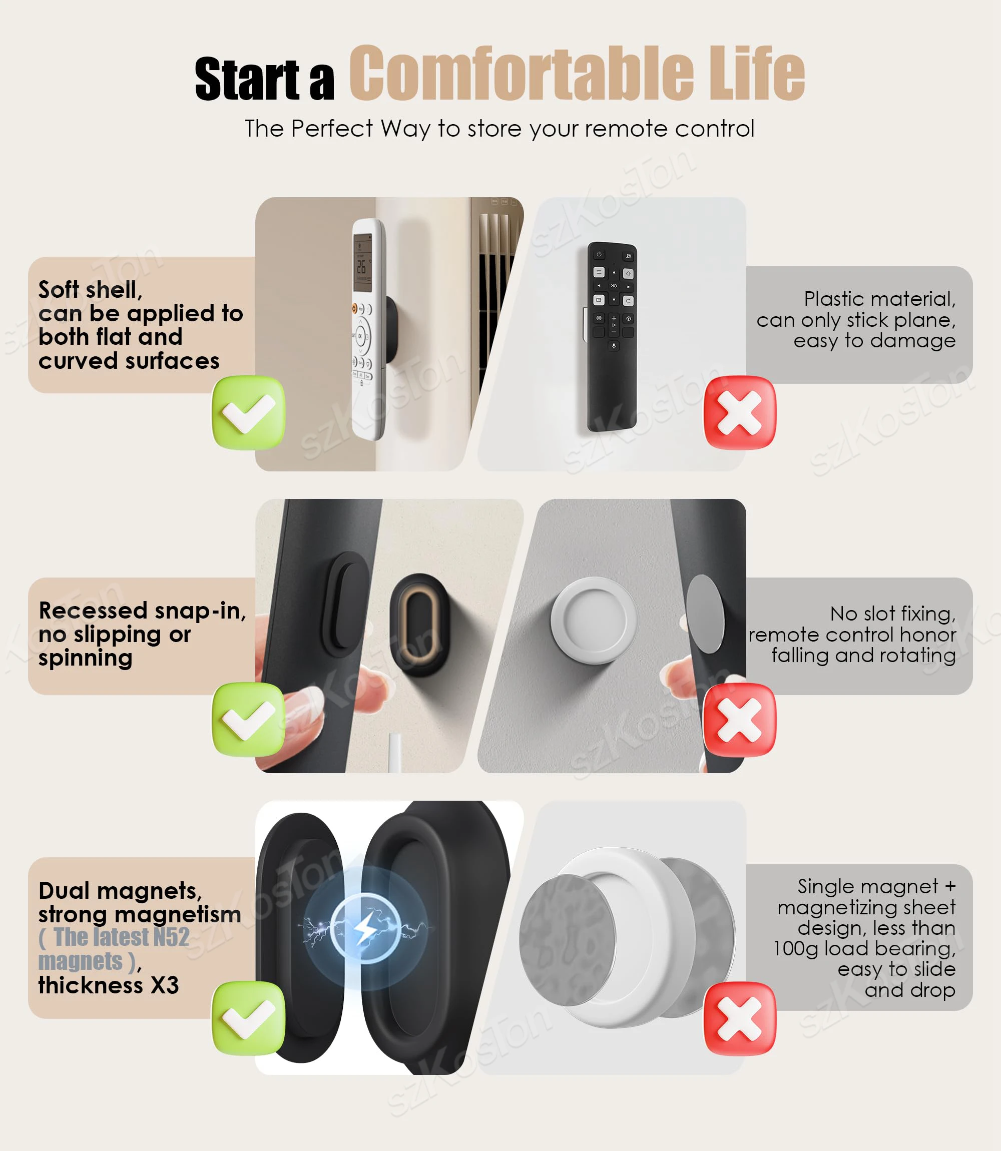【El primer soporte para control remoto de silicona】El diseño del imán envuelto en silicona es suave al tacto y no dañará la pared ni el control remoto cuando se despegue.También se agregó una ranura de límite, evita que el control remoto se caiga y le brinda una sensación de seguridad estable