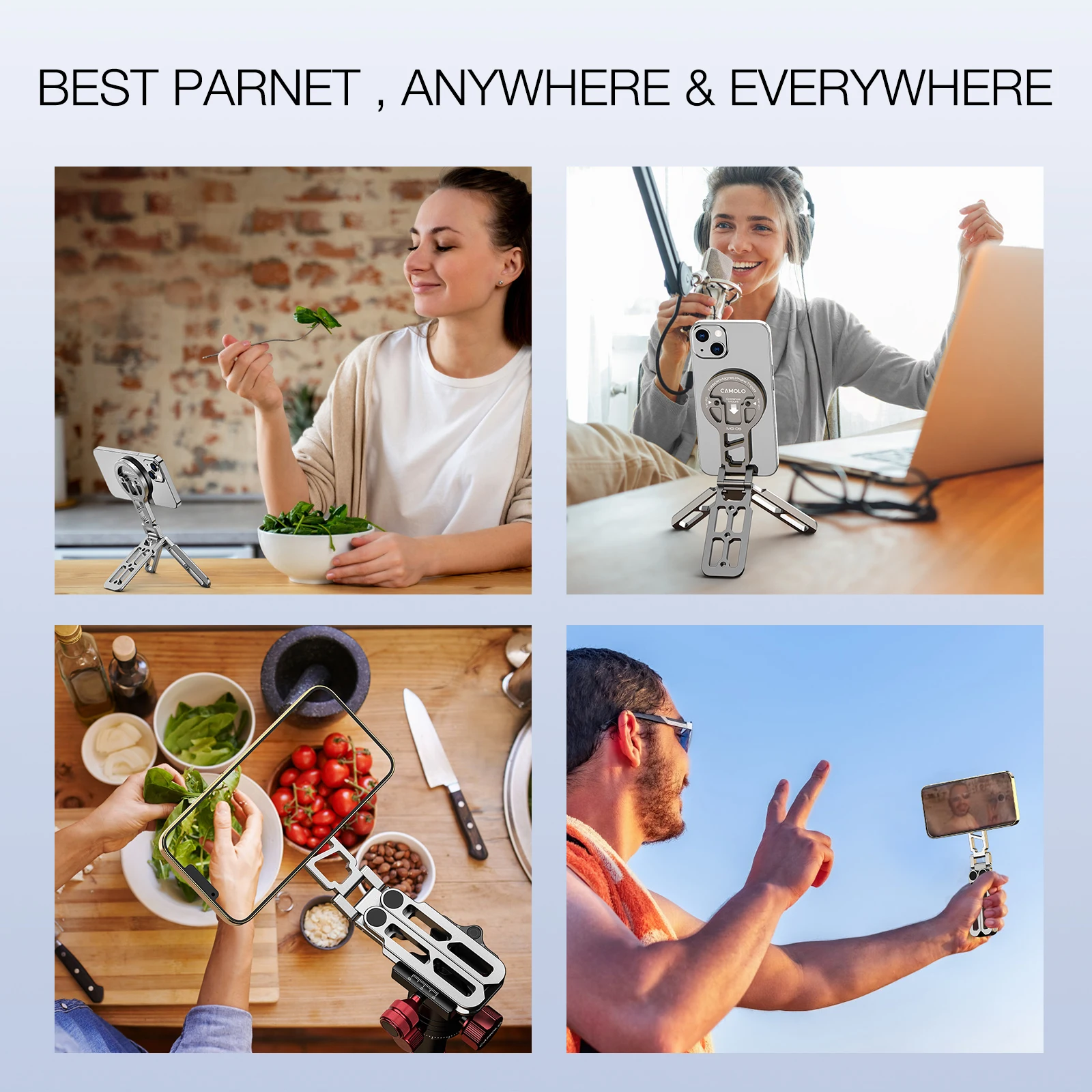 【Múltiples escenarios】Este trípode para teléfono magsafe se puede capturar en modo horizontal y modo retrato; Para entretenimientos, no solo se puede usar como soporte de teléfono de escritorio para ver videos verticalmente y ver películas horizontalmente, sino que también puede manejar estabilizador, palo selfie, toma superior, etc.