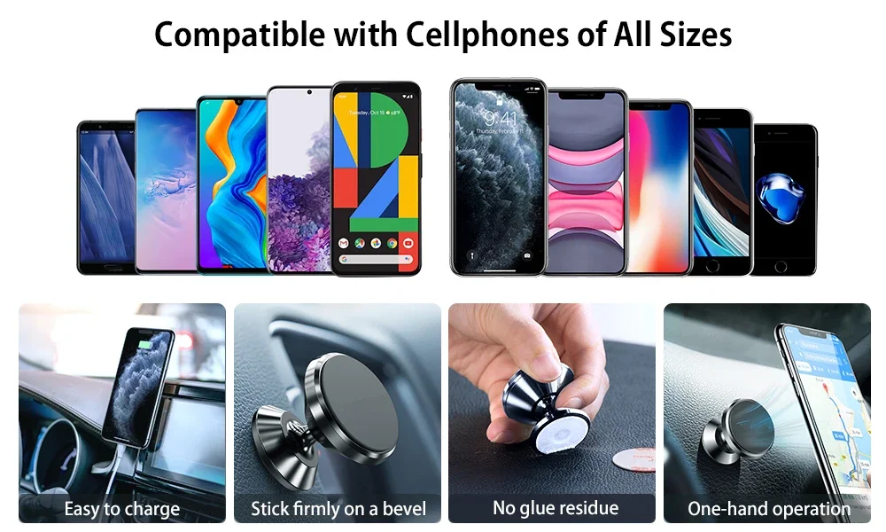 Soporte móvil para automóvil con imán: este soporte para teléfono móvil está equipado con un potente imán, que se puede fijar a la superficie magnética del automóvil y proporcionar con él, para que pueda usarlo con confianza.