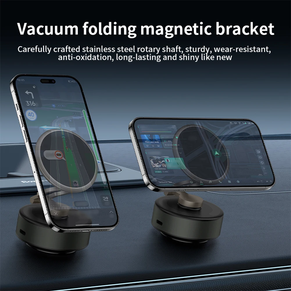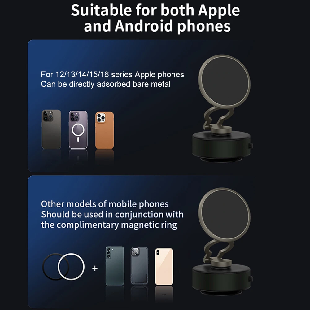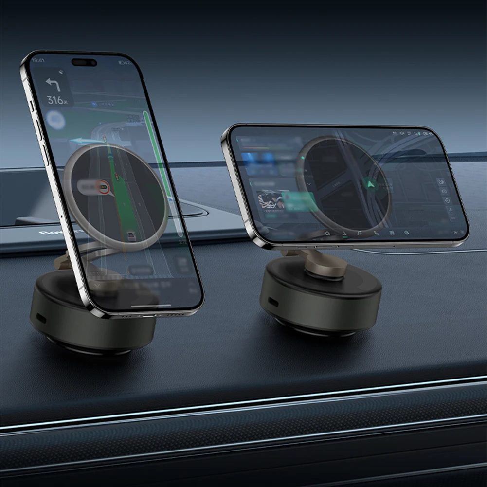 Feature:1.Innovative Design: Our revolutionary magnetic vacuum car phone holder features a unique electric suction cup with 360-degree rotation, adjustable axes for various viewing angles, ensuring a safer driving experience.