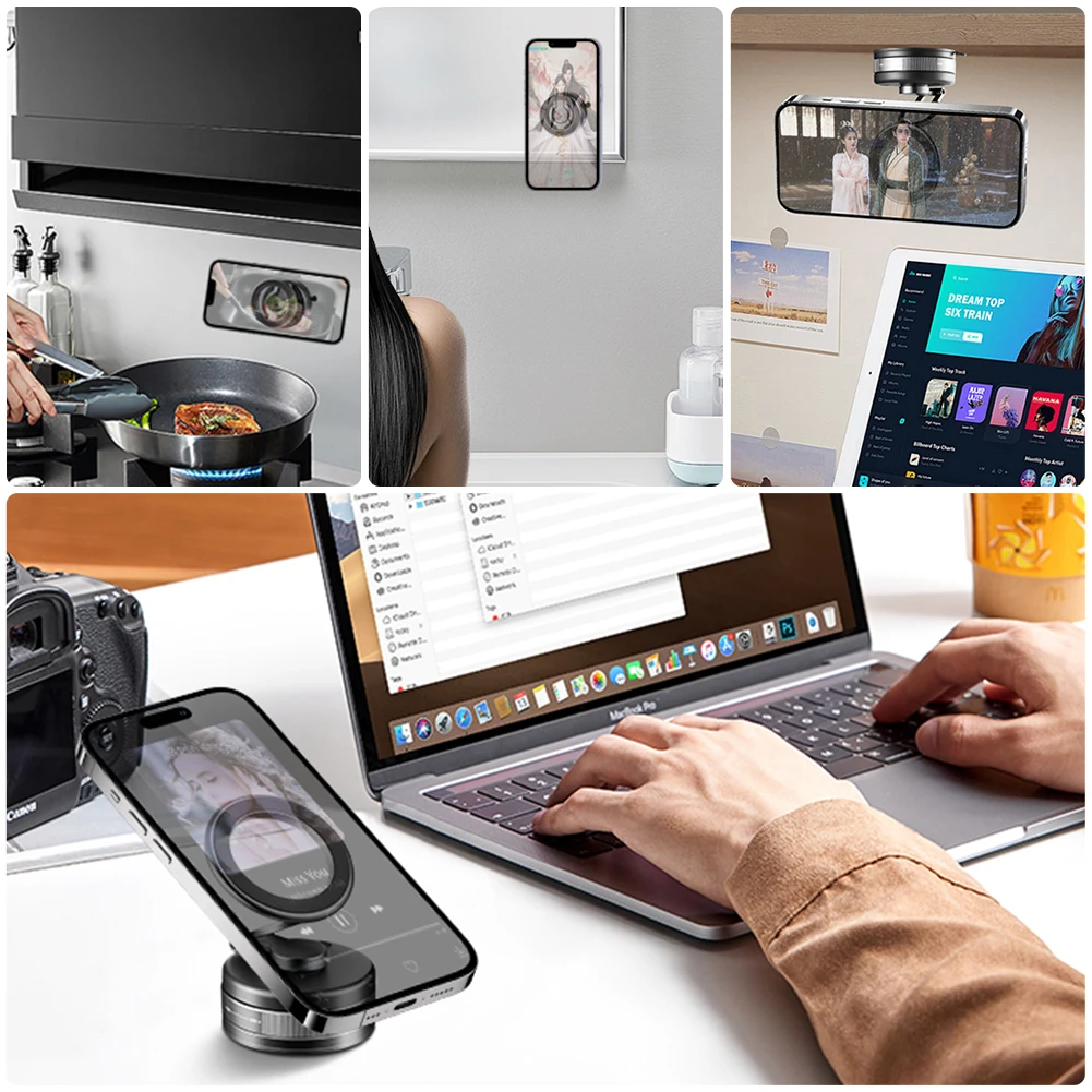 5. Adaptabilidad versátil:Más allá de servir como un excelente soporte magnético para teléfono para vehículo, este soporte plegable para teléfono móvil funciona excepcionalmente bien en paredes y espejos lisos, lo que agrega comodidad en cocinas o baños.