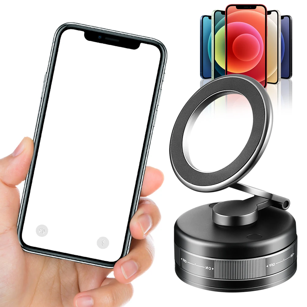 4. Compatibilidad universal del teléfono:Nuestro soporte para teléfono para automóvil con ventosa magnética al vacío giratoria de 360 grados es compatible con la serie iPhone 16/15/14/13/12.Para teléfonos no magnéticos, fije el anillo de metal incluido para una adhesión óptima.