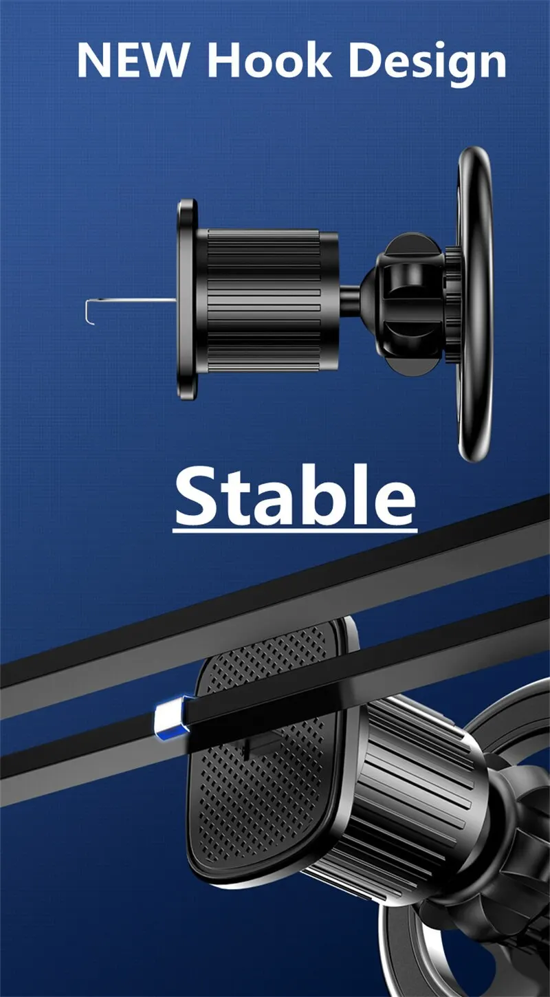 • Titular magnético:El soporte magnético asegura que su teléfono permanezca firmemente en su lugar mientras conduce, evitando que se caiga o resbale.