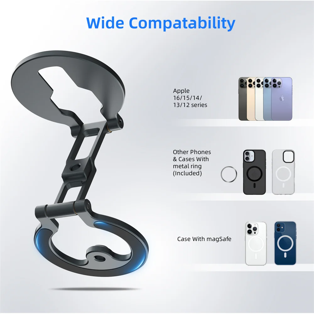 Diseño delgado y apto para bolsillos: Diseñado para su portabilidad, este soporte plegable para teléfono es compatible con la serie iPhone 16/15/14/13/12, así como con otros teléfonos y estuches con un anillo de metal (estuche magSafe incluido), lo que garantiza un fácil transporte y almacenamiento.