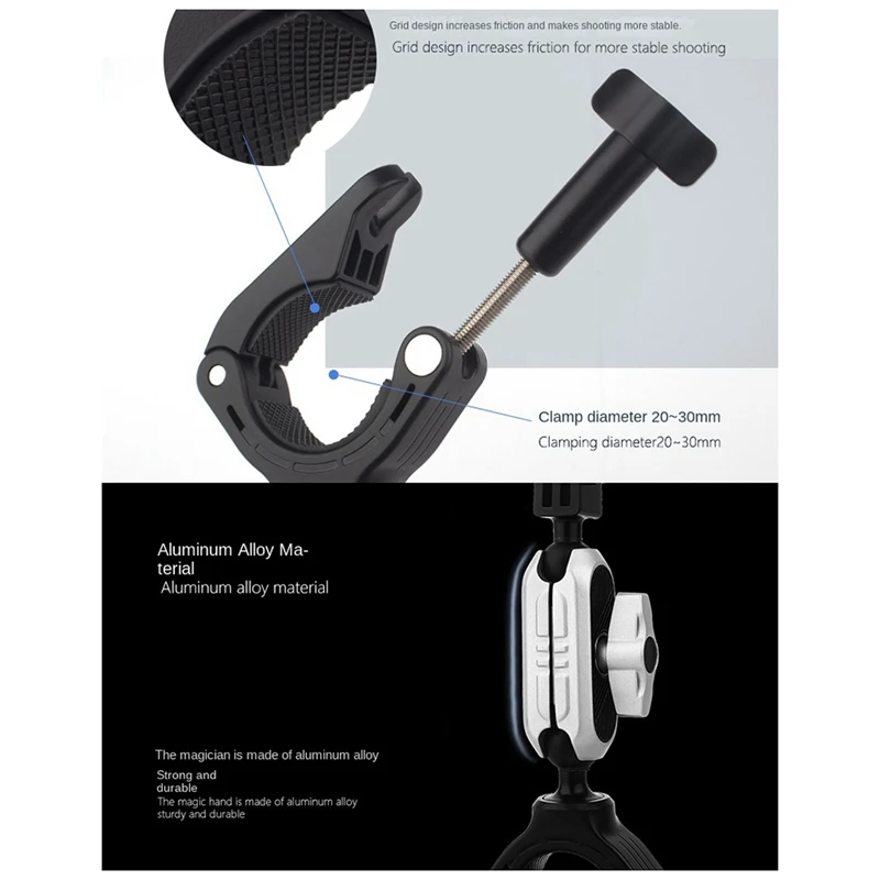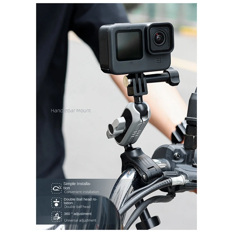 1. Compatibilidad multifuncional: el soporte del manillar es compatible con una serie de cámaras de acción, incluidas GoPro 11, 10, 9, Insta360, para DJI OSMO Action La mayoría de los teléfonos móviles en el mercado se pueden utilizar con clips 2. Fácil de instalar: el soporte se puede conectar fácilmente al manillar de la motocicleta o bicicleta, y también se puede utilizar como un soporte de espejo. 3. Material duradero: el soporte está hecho de material de alta calidad, que es duradero y puede soportar los rigores del uso al aire libre. 4. Ángulo ajustable: el ángulo de la montura se puede ajustar para facilitar la grabación desde diferentes ángulos. 5. Perfecto para actividades al aire libre: este soporte es perfecto para entusiastas del aire libre que aman el ciclismo, el motociclismo y otras actividades que desean capturar imágenes sobre la marcha.