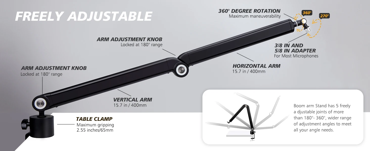 【Compatibilidad perfecta】Soporte para micrófono con adaptador estándar de 3/8" a 5/8", compatible con la mayoría de los micrófonos estándar.
