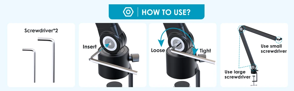 El paquete incluye: 1 soporte de micrófono de metal, 1 abrazadera de micrófono, 1 adaptador de 3/8" a 5/8" (ya montado), 4 clips para cables, 2 destornilladores, 1 manual de usuario. Fácil de instalar su micrófono hyperx en el brazo del micrófono. Si tiene alguna pregunta, no dude en contactarnos, le brindaremos orientación de uso y servicios de reemplazo gratuitos.