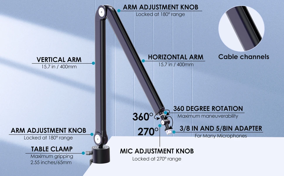 【DISEÑO MEJORADO】 Este soporte de micrófono proporciona un canal de administración de cables oculto, fácil de ocultar su cable xlr o usb, libera más espacio en su escritorio.La abrazadera de alta calidad tiene un cojín de silicona, no dañará su mesa.Y la abrazadera tiene un área de contacto más grande con la mesa, por lo que el soporte del micrófono no es fácil de sacudir.