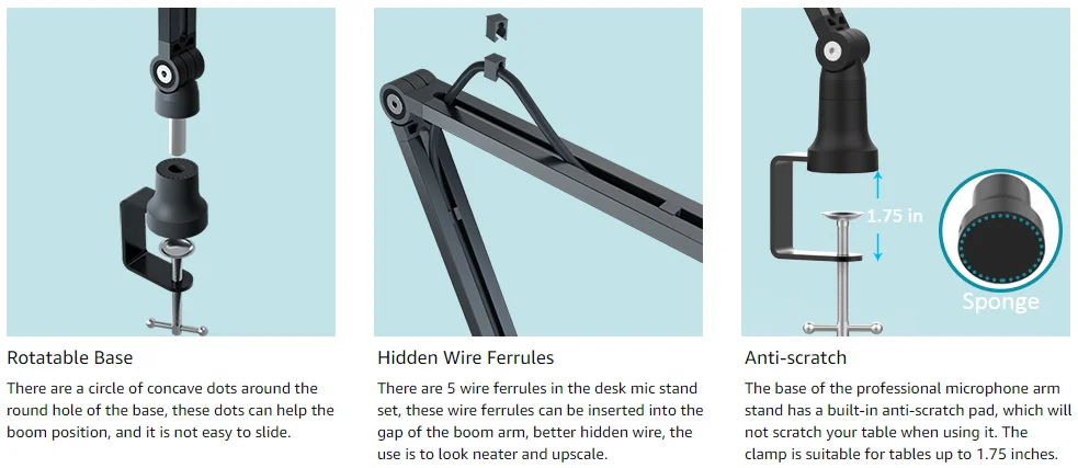 【Diseño íntimo】El juego de brazos de micrófono está equipado con un aro de alambre oculto, el cable del micrófono se puede ocultar en un canal de cable manteniendo su escritorio limpio y ordenado.El C-clip tiene almohadillas de silicona que no rayarán la mesa.El soporte del micrófono viene con una llave hexagonal para que pueda ajustar la tensión de los tornillos del soporte del micrófono en cualquier momento.