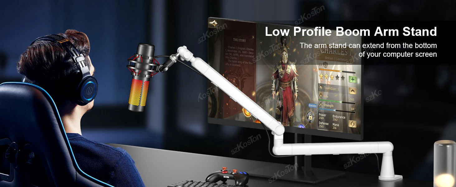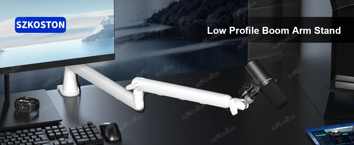 [Estilo de perfil bajo] El diseño elegante y que ahorra espacio garantiza que el soporte del micrófono con brazo articulado se ajuste perfectamente al entorno de grabación o podcasting.El soporte del brazo del micrófono se extiende desde la parte inferior de la pantalla, manteniendo un espacio de trabajo limpio y sin obstáculos.