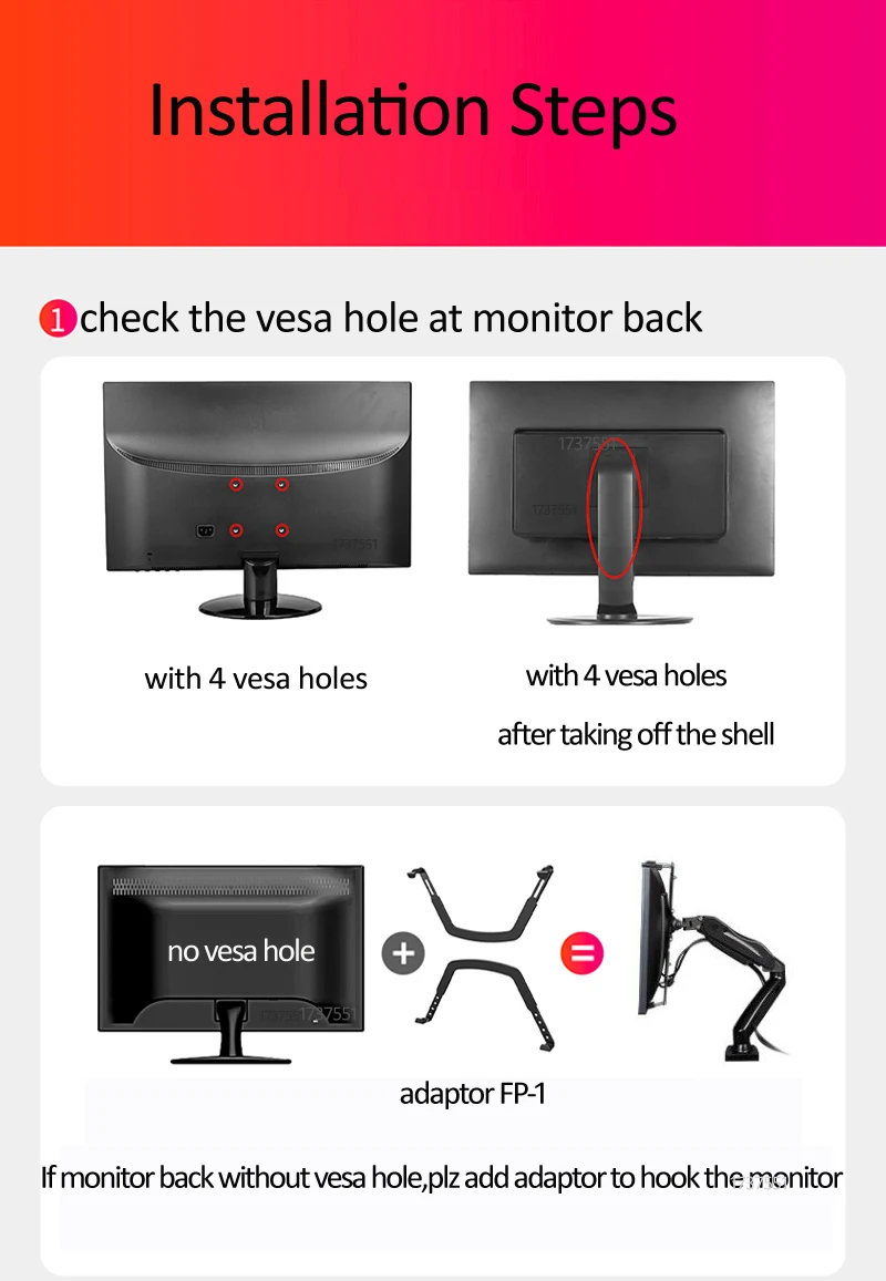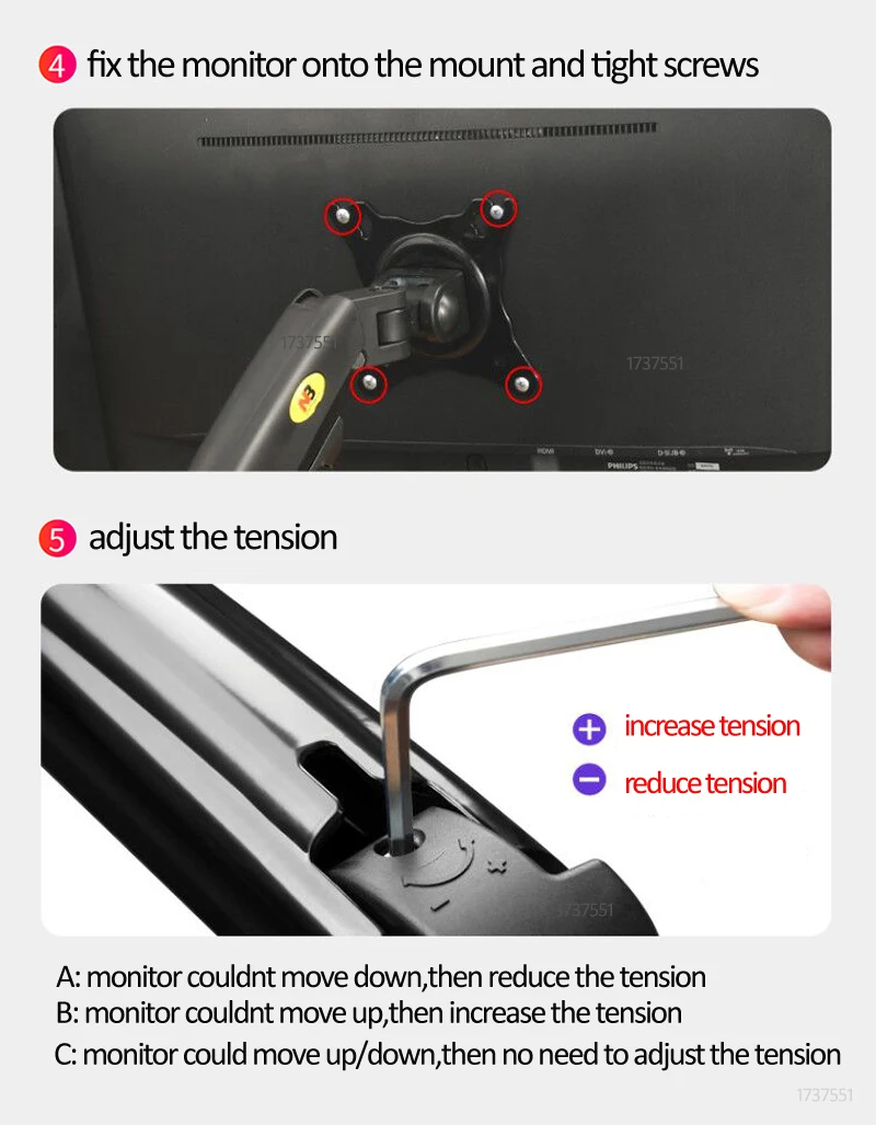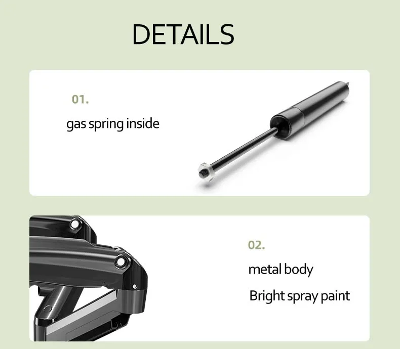 Carga: 2-9kg paraCada pantalla(Por favor, asegúrese de que su pantalla esté dentro de este rango, o el resorte de gas del soporte no podría funcionar)