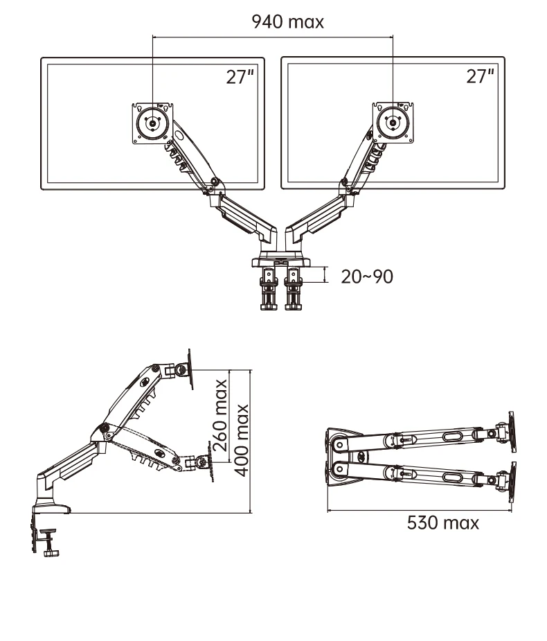 Carga: 2-9kg paraCada pantalla(Por favor, asegúrese de que su pantalla esté dentro de este rango, o el resorte de gas del soporte no podría funcionar)