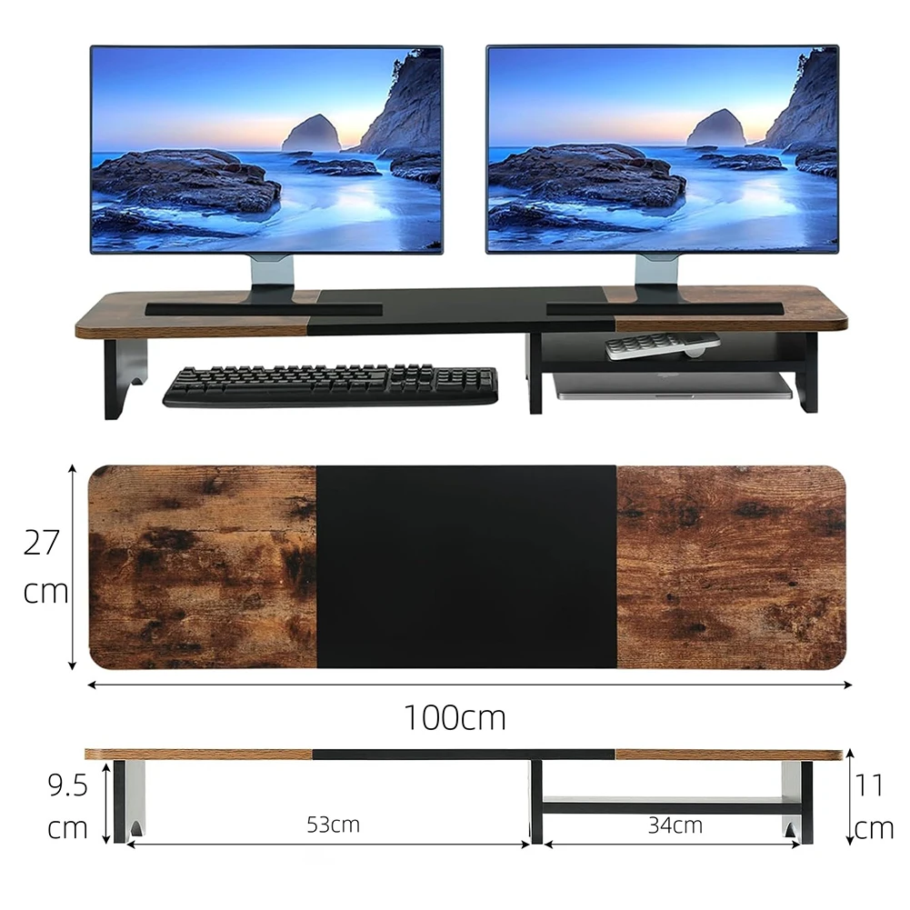 1.Superficie espaciosa:El generoso panel de 100x27 cm del soporte para monitor dual se adapta a la mayoría de las pantallas, se adapta a computadoras de 17-27 pulgadas con facilidad y ofrece un amplio espacio para una computadora portátil, monitor, impresora u otros dispositivos simultáneamente.