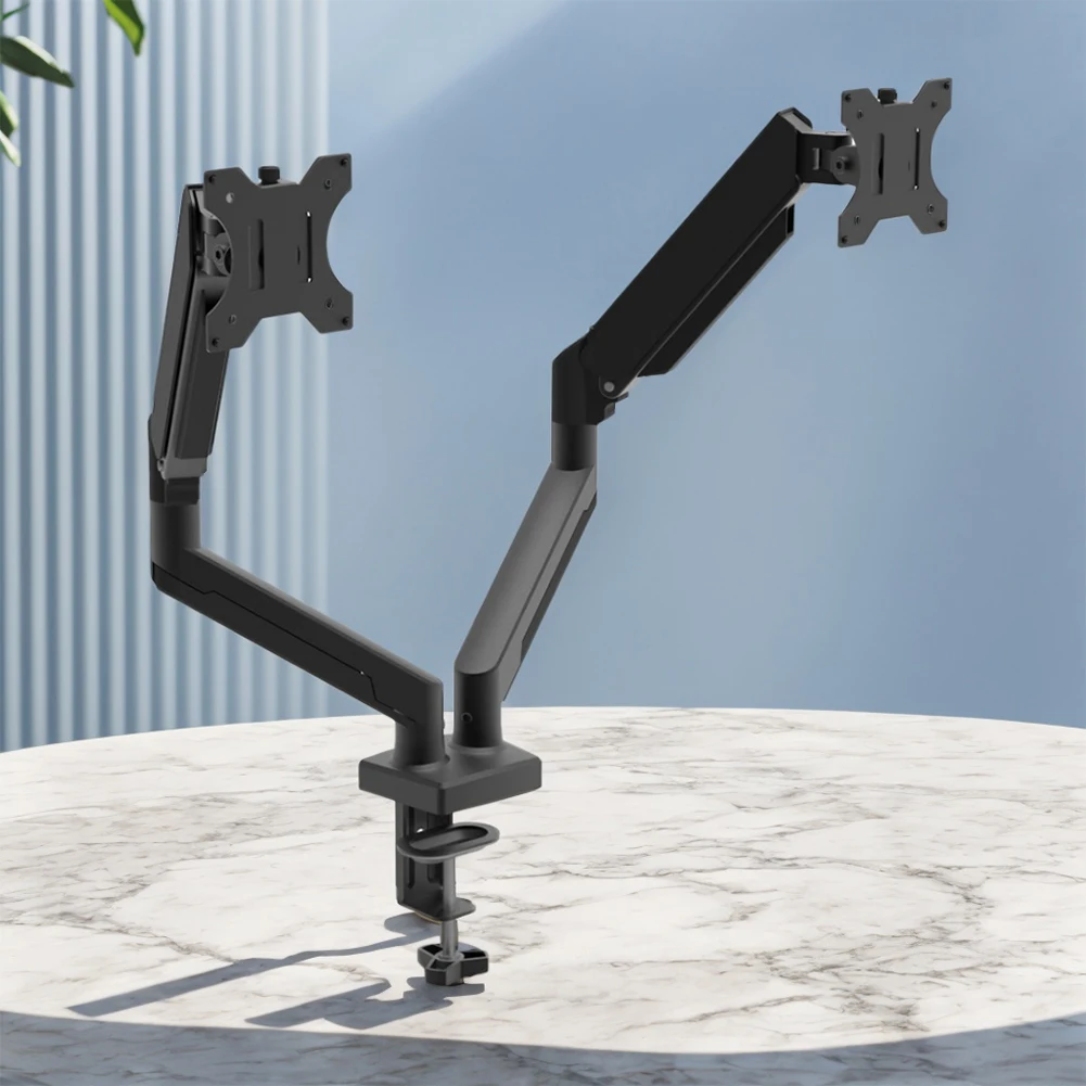 1.Aumentar la productividad:Di adiós a las configuraciones ineficientes de pantalla dual.Este soporte para monitor dual ofrece una solución perfecta con su estructura totalmente ajustable, lo que permite una rotación fácil y suave en cualquier dirección.Trabaje cómodamente durante largas horas en su escritorio sin experimentar rigidez en el cuello ni dolor de espalda.