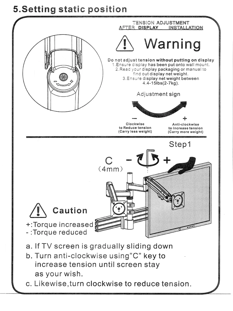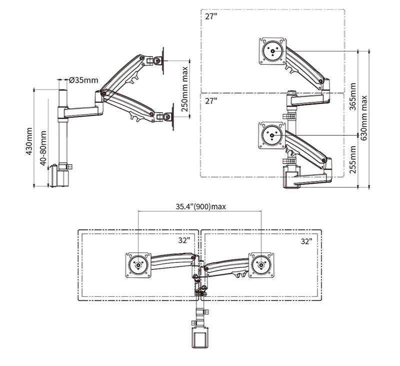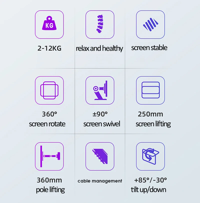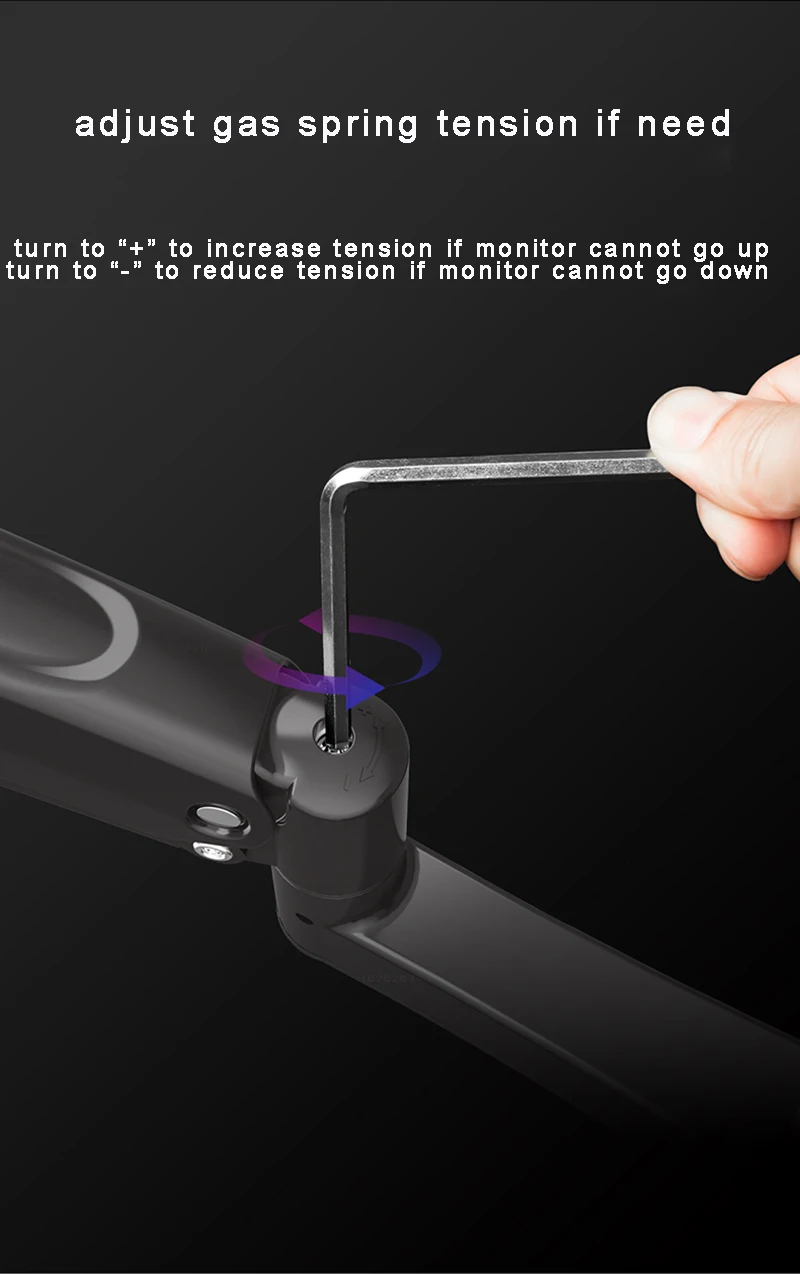Carga:2-12kg cada pantalla (por favor, asegúrese de que su pantalla está dentro de este rango, o el resorte de gas del montaje podría funcionar)